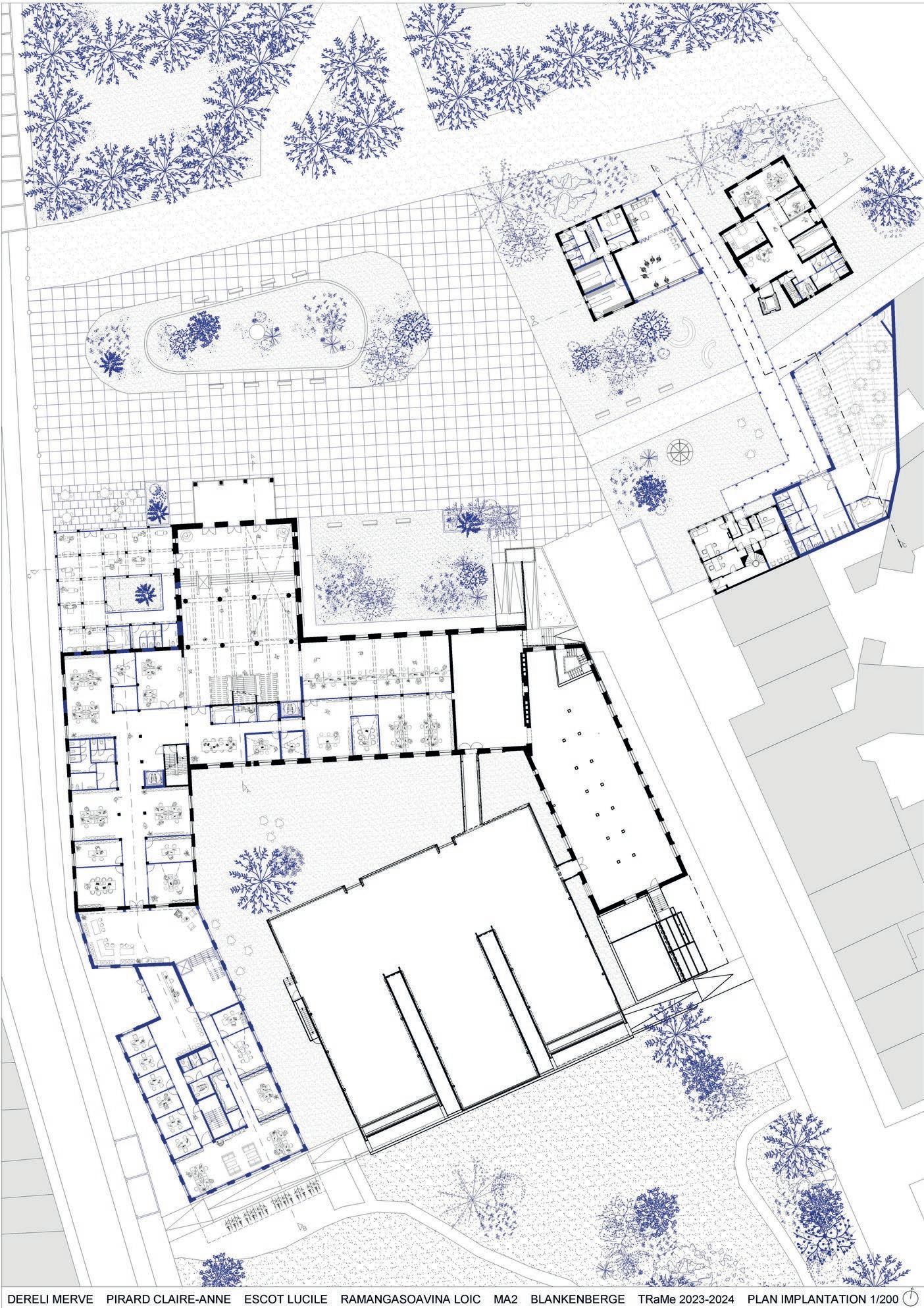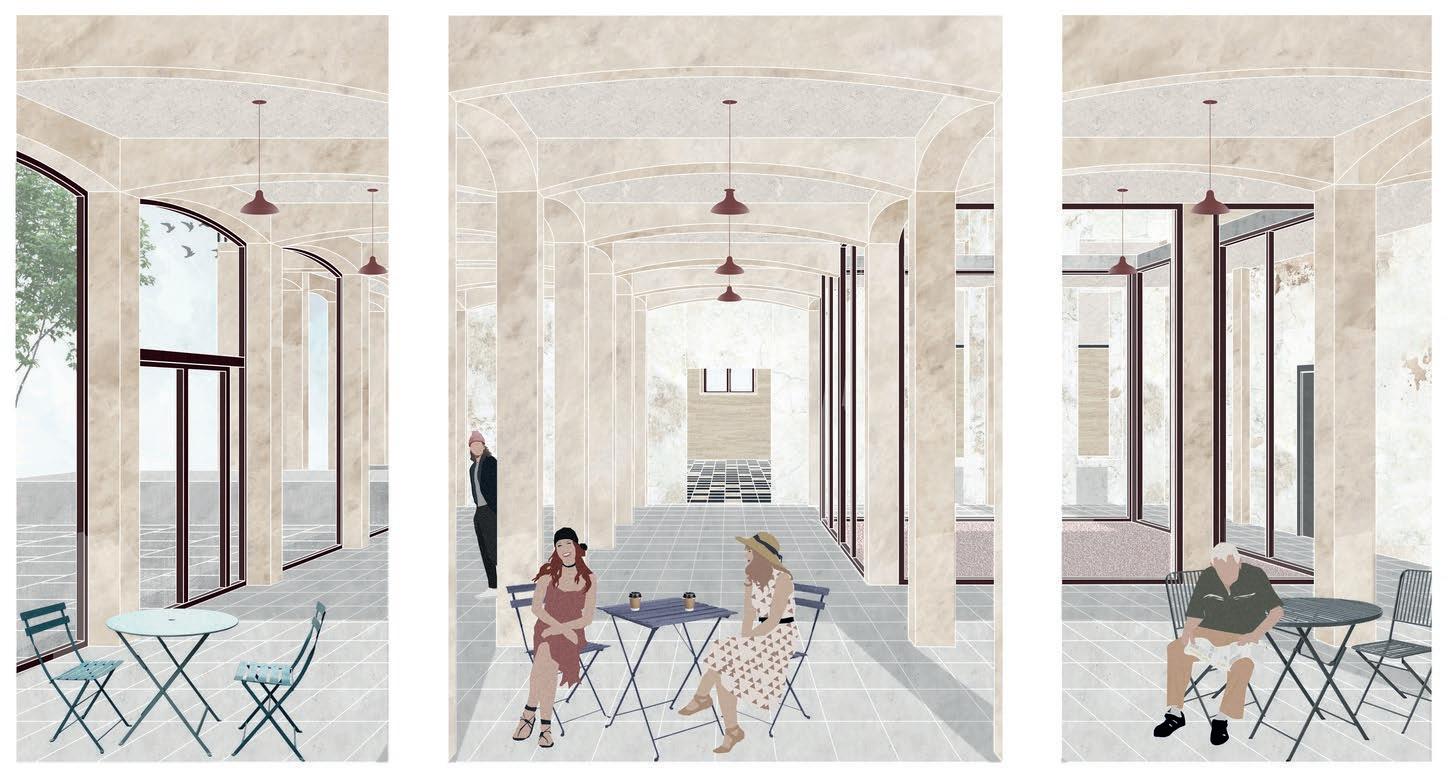 As for the community centre, the buildings are floating, so the creation of an external gallery will allow them to be anchored back to the site, while the extensions will allow the space to be enlarged to accommodate the new activities of the community centre. In order to connect these two centres, we are creating a pedestrian forecourt, which highlights the monumental entrance to the community centre, which in the context of this project becomes functional once again.