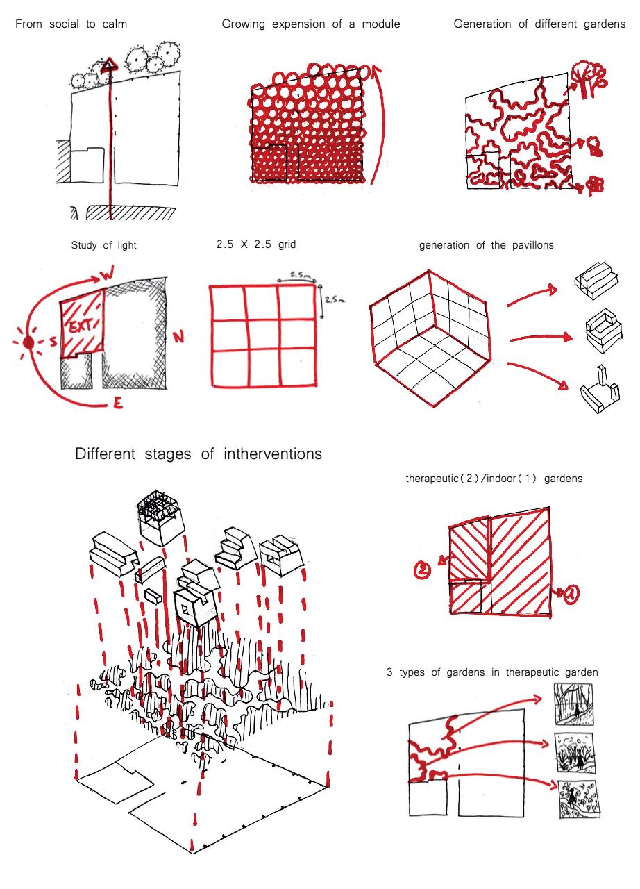 Here we can see how this notion of private/public takes place in the street. We noticed that they very often demarcate these areas with objects. This study made us realise that many people suffering from mental illness end up on the streets because their lifestyle has deteriorated. So we decided to do a project on rehabilitation centres, but for whom? This was an important question, because right from the start we were aware of the women who find themselves in very complex situations once on the streets. That’s how the idea of a rehabilitation centre for these women came about.