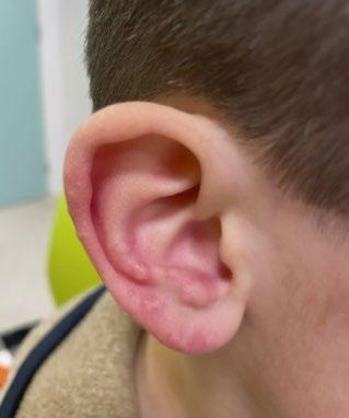 chiatrische ondersteuning. Bij diffuse intracraniële afwijkingen dient een individueel, multidisciplinair behandel- en opvolgplan gemaakt te worden op basis van herhaalde beeldvorming, neurochirurgie, medicamenteuze behandeling en klinische opvolging. Behandeling van CMN is uitdagend. Het wordt afgeraden om therapieën te gebruiken die littekenvorming veroorzaken, zoals laserbehandeling, curettage en dermabrasie, omdat deze de uiteindelijke kleur van het letsel niet beïnvloeden en het risico op maligne transformatie blijft bestaan. Tijdens de presentatie werden twee belangrijke genetische mutaties besproken die bijdragen aan het meerendeel van CMN: NRAS-(68%) en BRAF-mutaties(7%). Recente bevindingen van Prof. Veronica Kinsler en haar team hebben de rol van fusiegenen, voornamelijk BRAF-fusies, aangetoond. Deze fusiegenen zijn geassocieerd met hyperactiviteit van de MAPK-pathway, die kan worden geremd door trametinib, een MEK-inhibitor. Enkele succesvolle gevallen zijn beschreven waarbij trametinib aanzienlijke verbetering bracht bij ernstige CMN veroorzaakt door een BRAF-fusiegen (Figuur 1). Deze presentatie benadrukte het belang van verder genetisch onderzoek bij CMN voor diagnose en therapie van deze soms ernstige huidletsels.