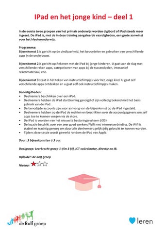IPad en het jonge kind – deel 1 In de eerste twee groepen van het primair onderwijs worden digibord of iPad steeds meer ingezet. De iPad is, met de in deze training aangeleerde vaardigheden, een grote aanwinst voor het kleuteronderwijs. Programma: Bijeenkomst 1 is gericht op de vindbaarheid, het beoordelen en gebruiken van verschillende apps in de onderbouw. Bijeenkomst 2 is gericht op Rekenen met de iPad bij jonge kinderen. U gaat aan de slag met verschillende reken apps, categoriseren van apps bij de tussendoelen, interactief rekenmateriaal, enz. Bijeenkomst 3 staat in het teken van instructiefilmpjes voor het jonge kind. U gaat zelf verschillende apps ontdekken en u gaat zelf ook instructiefilmpjes maken. Benodigdheden: • Deelnemers beschikken over een iPad. • Deelnemers hebben de iPad starttraining gevolgd of zijn volledig bekend met het basis gebruik van de iPad. • De benodigde accounts zijn voor aanvang van de bijeenkomst op de iPad ingesteld. • Deelnemers hebben op de iPad de rechten en beschikken over de accountgegevens om zelf apps toe te kunnen voegen via de store. • De iPad is voorzien van het nieuwste besturingssysteem (iOS). • De locatie beschikt over een zeer goed werkend Wifi met internetverbinding. De Wifi is stabiel en krachtig genoeg om door alle deelnemers gelijktijdig gebruikt te kunnen worden. • Tijdens deze sessie wordt gewerkt rondom de iPad van Apple. Duur: 3 bijeenkomsten á 3 uur. Doelgroep: Leerkracht groep 1 t/m 3 (4), ICT-coördinator, directie en IB. Opleider: de Rolf groep Niveau: