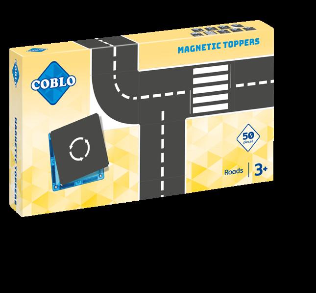 With these road pieces, children can turn their Coblo set into a cool roadway. The magnetic toppers are the size of a Coblo block, and thanks to the black layer on the bottom (with magnetic particles), children can easily click the toppers onto the Coblo blocks; they fit perfectly. Note: The magnetic toppers are not magnetic by themselves, you need Coblo blocks to attach the toppers to surfaces