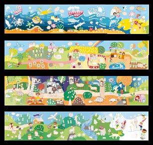 A giant class frieze with 28 A3 color plates on landscapes (sea, countryside, forest, mountain). Children can work individually or in groups, at tables or on the wall. It supports learning about landscapes, animals, plants, shapes, colors, weather, and vocabulary while encouraging creativity, collaboration, oral expression, observation, and fine motor skills.