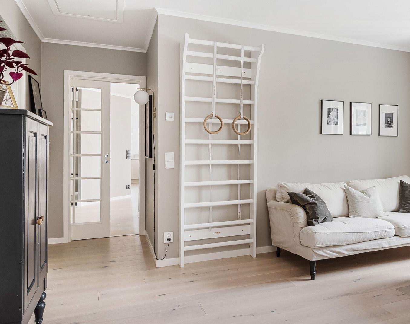 Vi har knappt hunnit ta av oss skorna innan Sam, sonen i familjen, vill visa oss barnens del av huset: TV-rummet med ribbstol och ringar. ”Det första alla barn gör när de kommer hit är att klättra i ribbstolen. En klockren möbel att ha här”, säga mamma Cecilia. ”Däremot är vi glada över skjutdörren som är mellan denna del och övriga huset”, fortsätter Cecilia och ler.