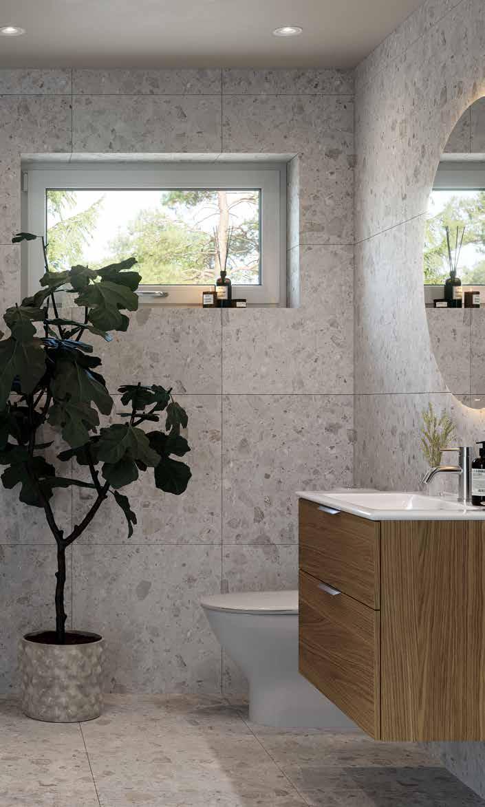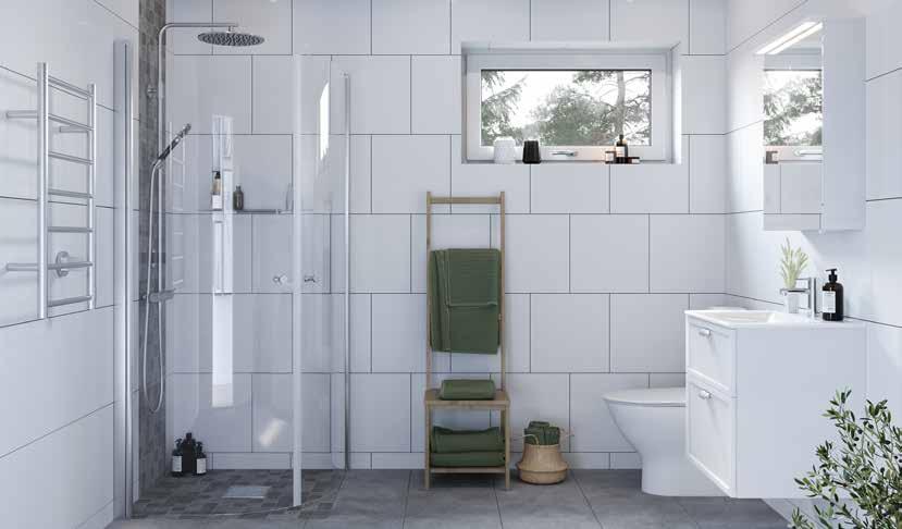 Helkaklat wc/dusch och badrum i alla våra hus är ett exempel på generös grundstandard. Annat exempel är att alla våra hus levereras med golvvärme i plattan, massiva innerdörrar och för de hus som har trappa är vitlaserad furu en självklar grundstandard för oss.