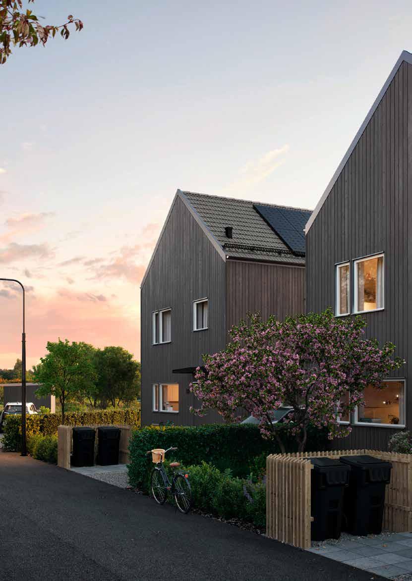 Kedjehusen byggs i trä och får grå träfasader och mellangrå takpannor. Till huset finns en uppfart med plats för minst två bilar och ett utvändigt förråd. På taket fångar solcellerna solens strålar, och omvandlar dem till lägre elkostnader och hållbar energiförsörjning. Skönt för både plånboken och magkänslan.