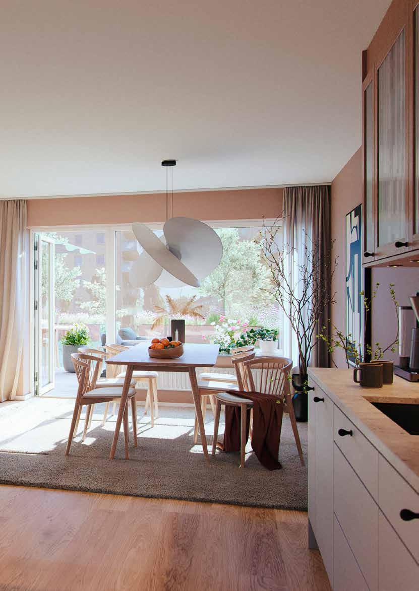 Balkong/uteplats: Inglasad eller öppen balkong. Lägenheter i markplan har trädäck och några har trädgård att sköta om som sin egen. Terrasser på plan fyra har trätrall.