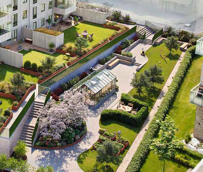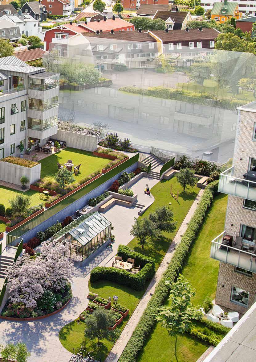Utemiljö: Gemensam grillplats och utekök. Orangeri, plats för lek, odlingslådor och cykelparkeringar. Plattsatta möblerade ytor, planteringar och gräs.