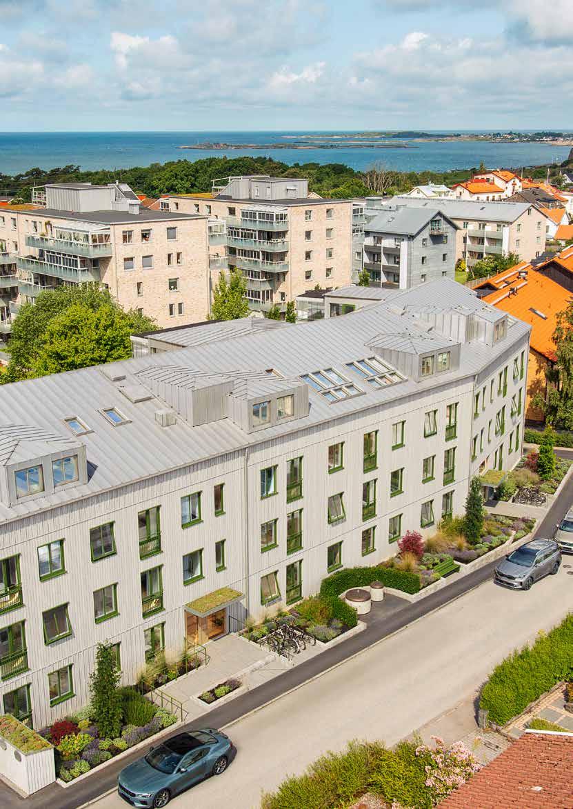 Yttertak: Plåttak på lägenhetshuset. Sedumtak på komplementbyggnad.
