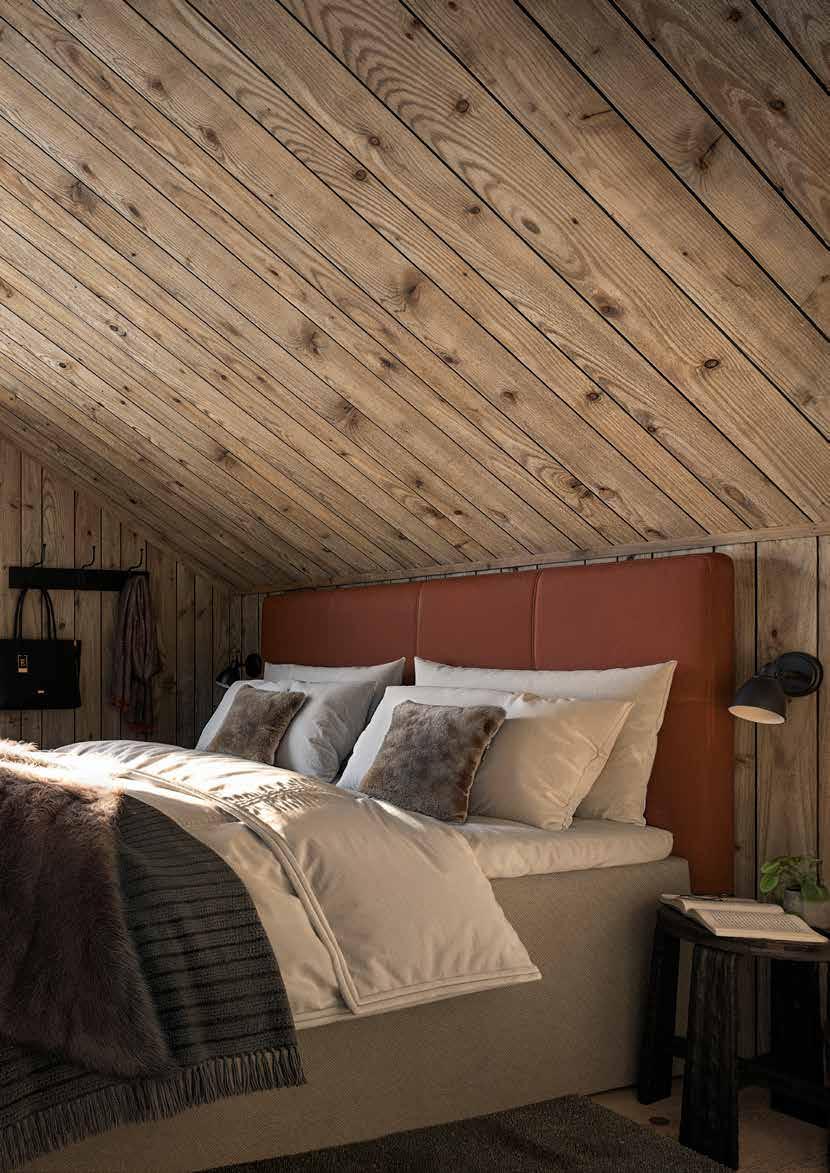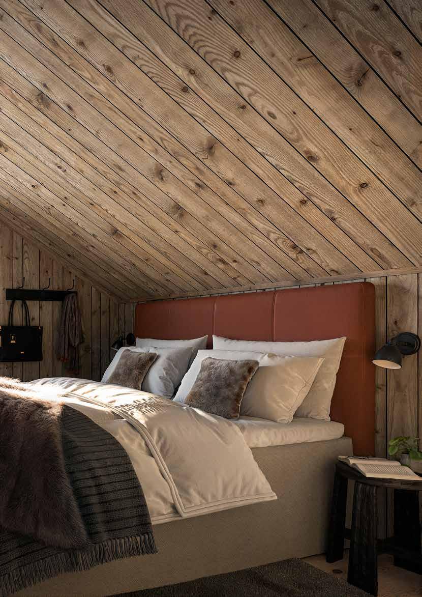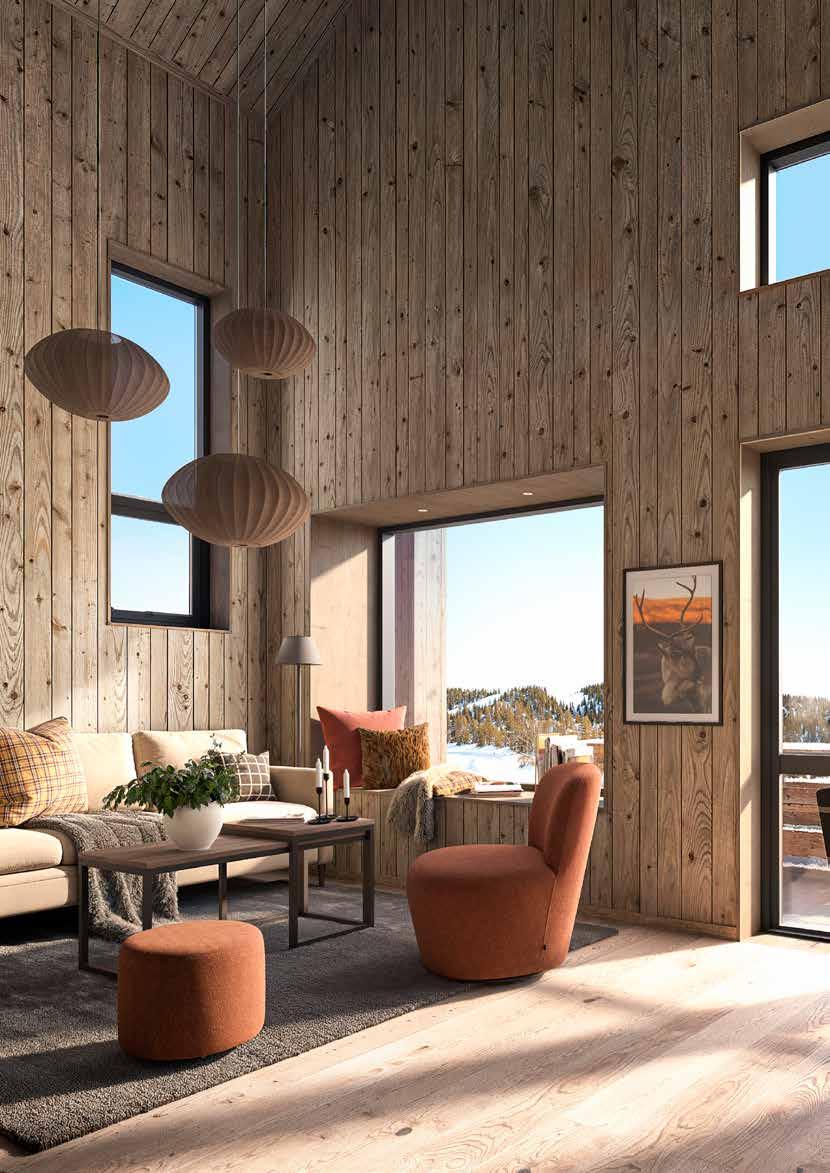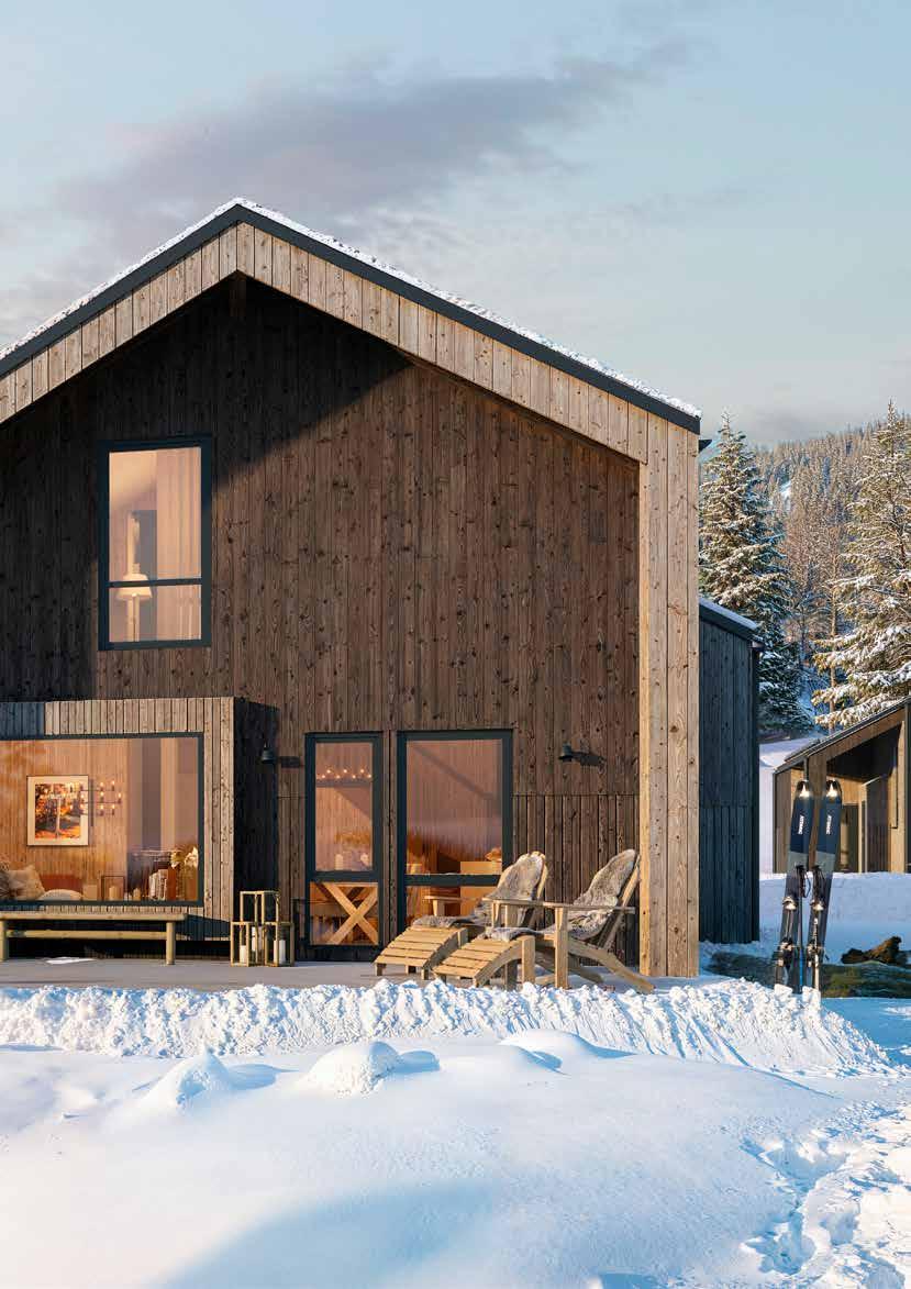 Naturliga material som smälter in Tanken bakom materialvalen är att skapa ett enhetligt och sammanhållet uttryck, samtidigt som det skapar en stark karaktär och variation i området. Fasaderna kläs i värmebehandlad fura, pigmenterad i två kulörer – en ljus och en mörk. Tonerna skiftar mellan stugorna och fångar upp nyanserna i skogen omkring, och därmed förstärker ett naturligt uttryck av husens gestaltning gentemot omkringliggande miljö.