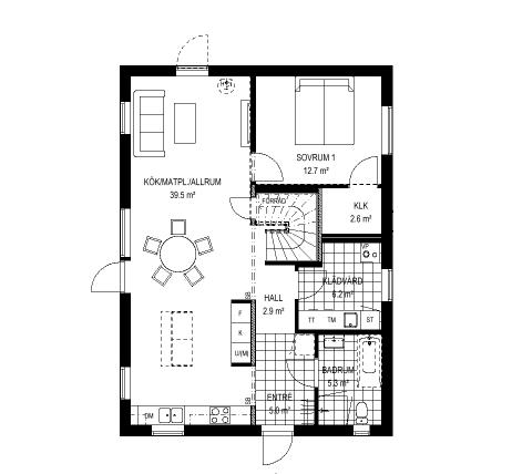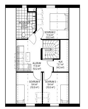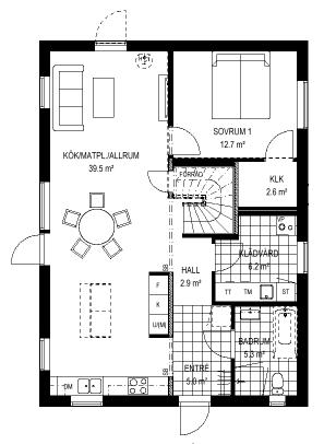 Ljuset från det härligt stora vardagsrummet och uteplatsen möter dig redan i entrén. Du lastar smidigt in matkassarna rakt in i köket utan att behöva ta av dig skorna. På andra sidan har du badrummet – praktiskt när du vill tvätta av barnen innan de kommer in i huset. Huset är som gjort för härliga sommardagar, med helglasade dörrar till en stor uteplats. Och den mysiga övervåningen blir en favoritplats för barnen att dra sig undan och ta det lugnt. Här uppe finns såväl badrum som klädkammare och ett stort allrum med ljusa takfönster.