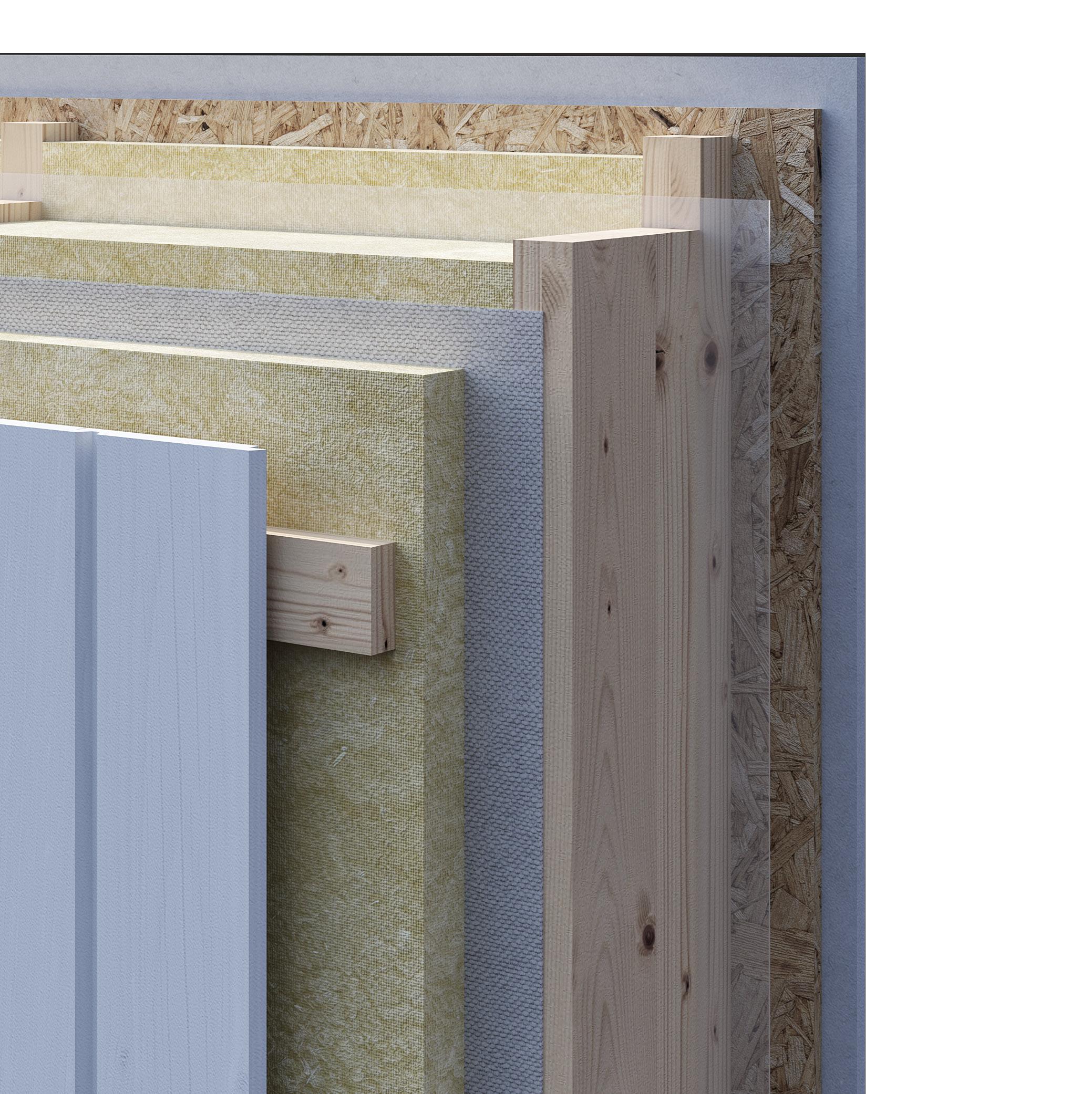 • Innanför fasadskivan monteras vår vindskyddande duk. Med denna placering ges bästa funktion och säker lufttätning.