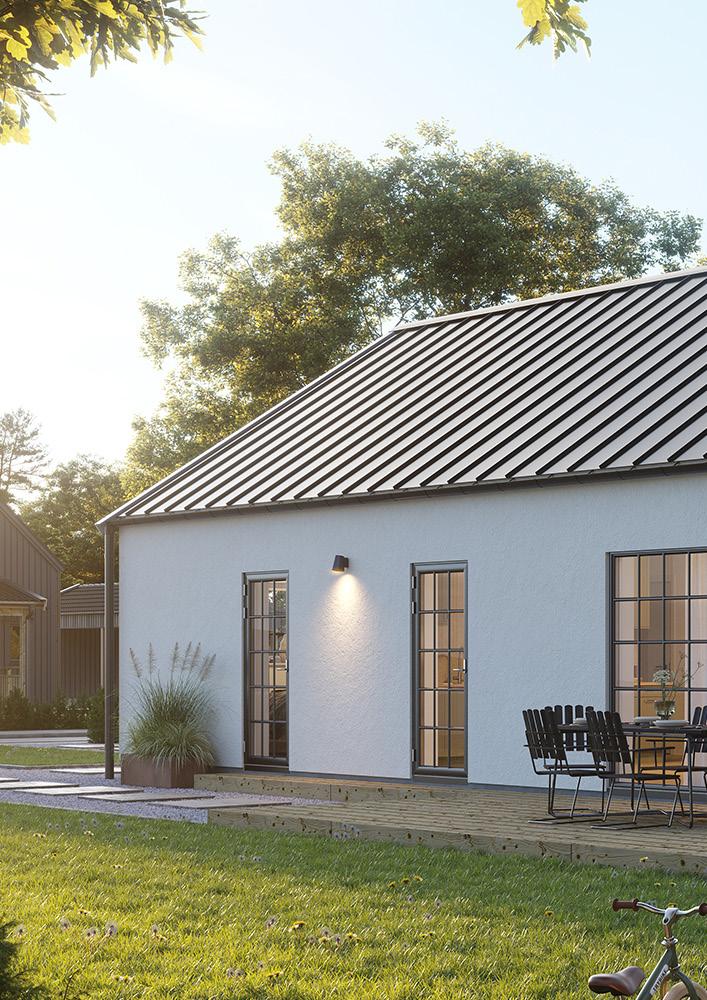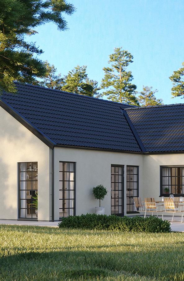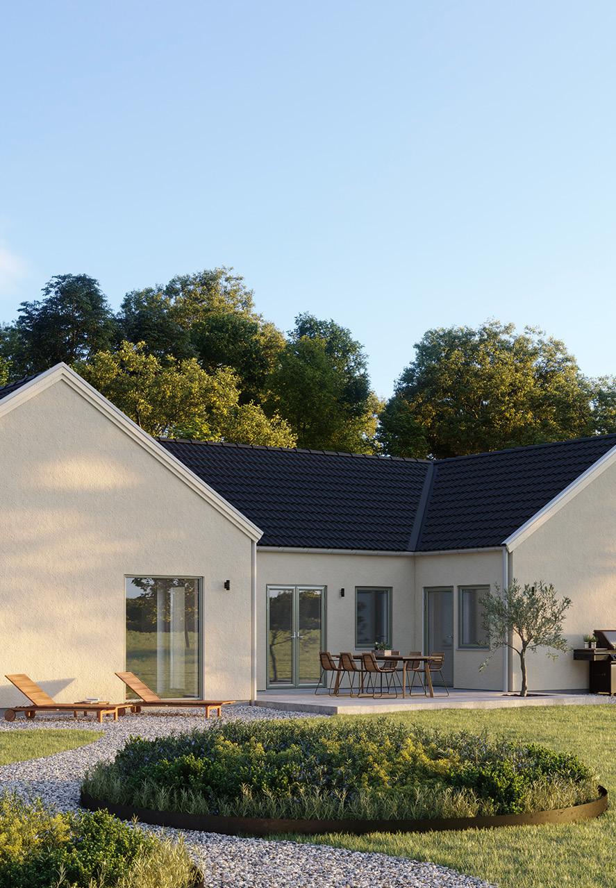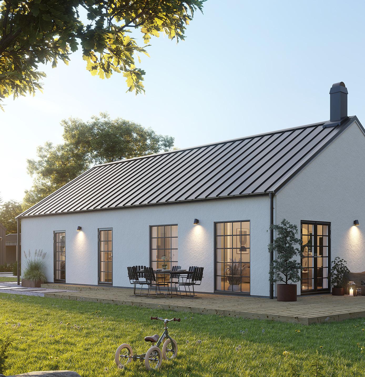 Husen får en klassisk skånsk putsfasad som ger ett stilrent och tidlöst uttryck. Du väljer själv fasadfärg - vit, beige, sandgul eller grå - och kan anpassa taket med antingen plåt eller betongpannor, alltid i elegant svart. Kontakta trähussäljaren för mer information.