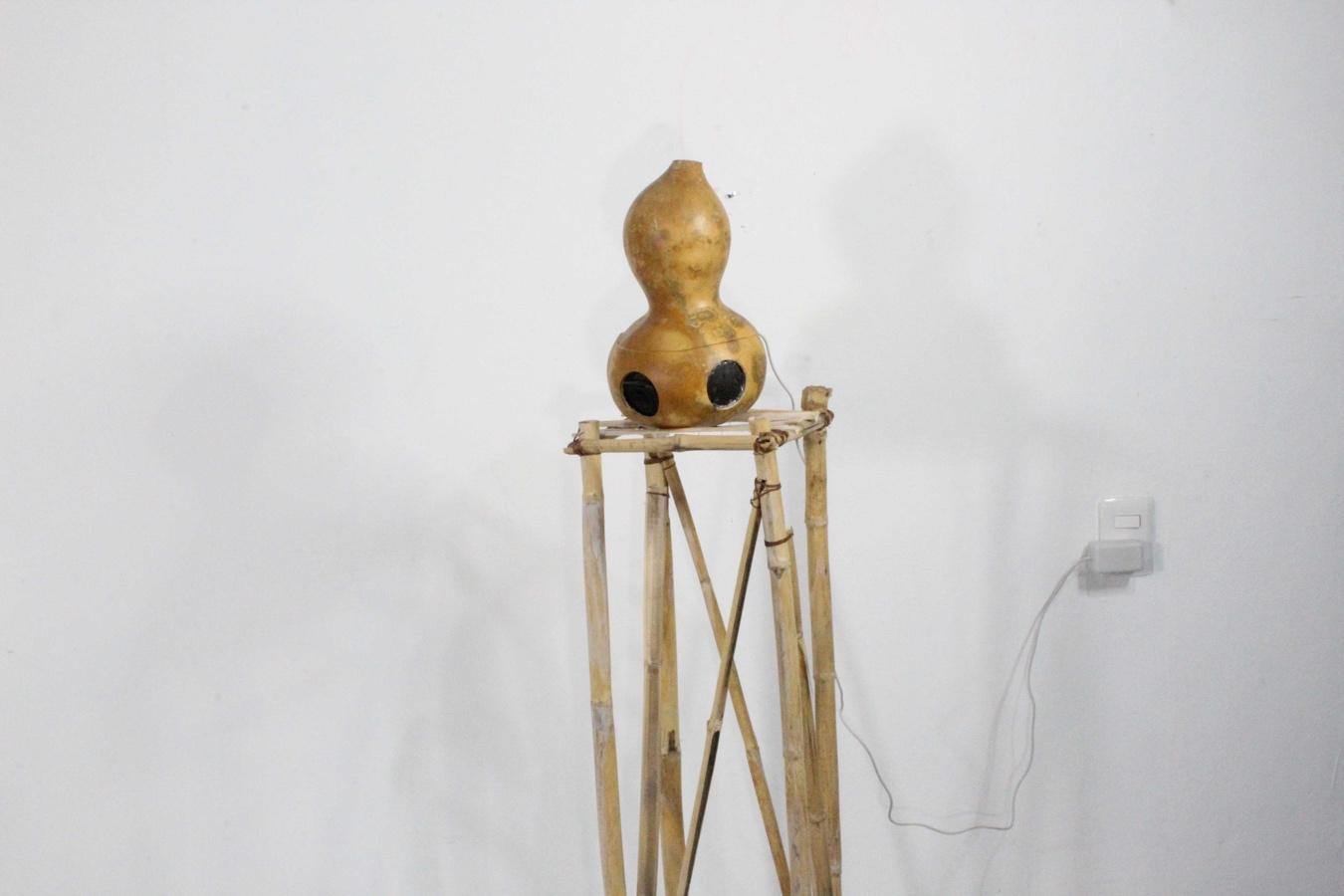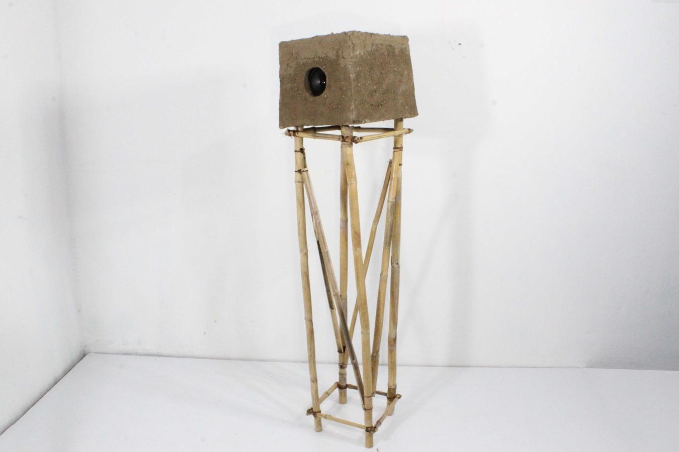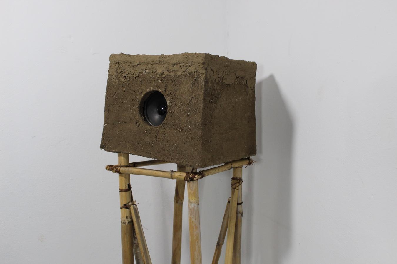 bocina bluetooth, carrizo, barro, tierra, hilo encerado, audio mp3. 27x27x125