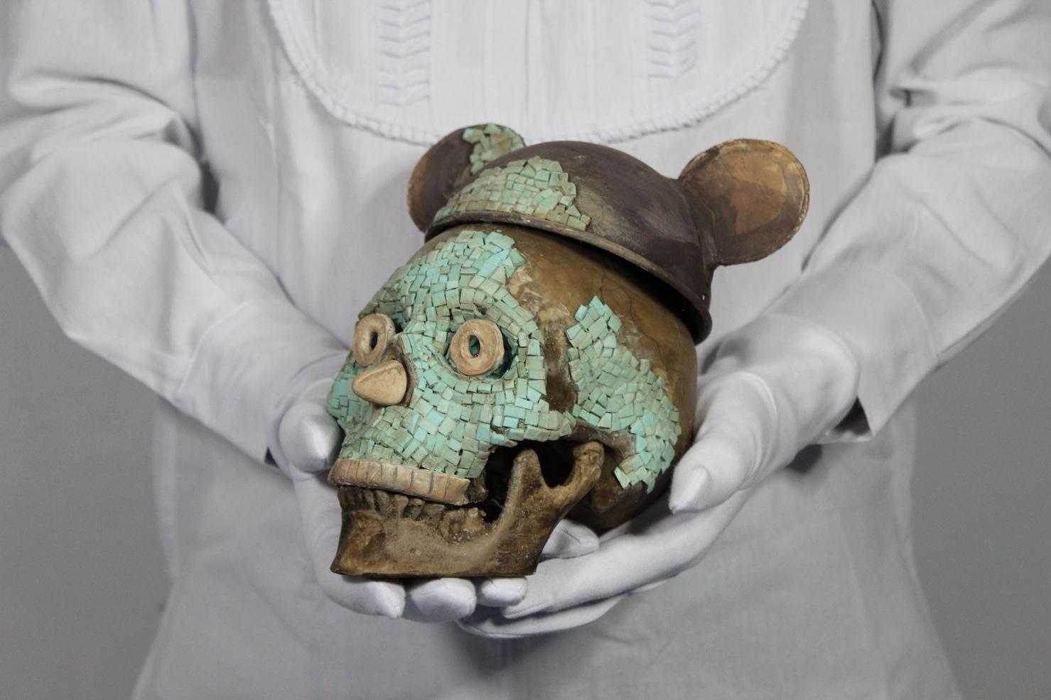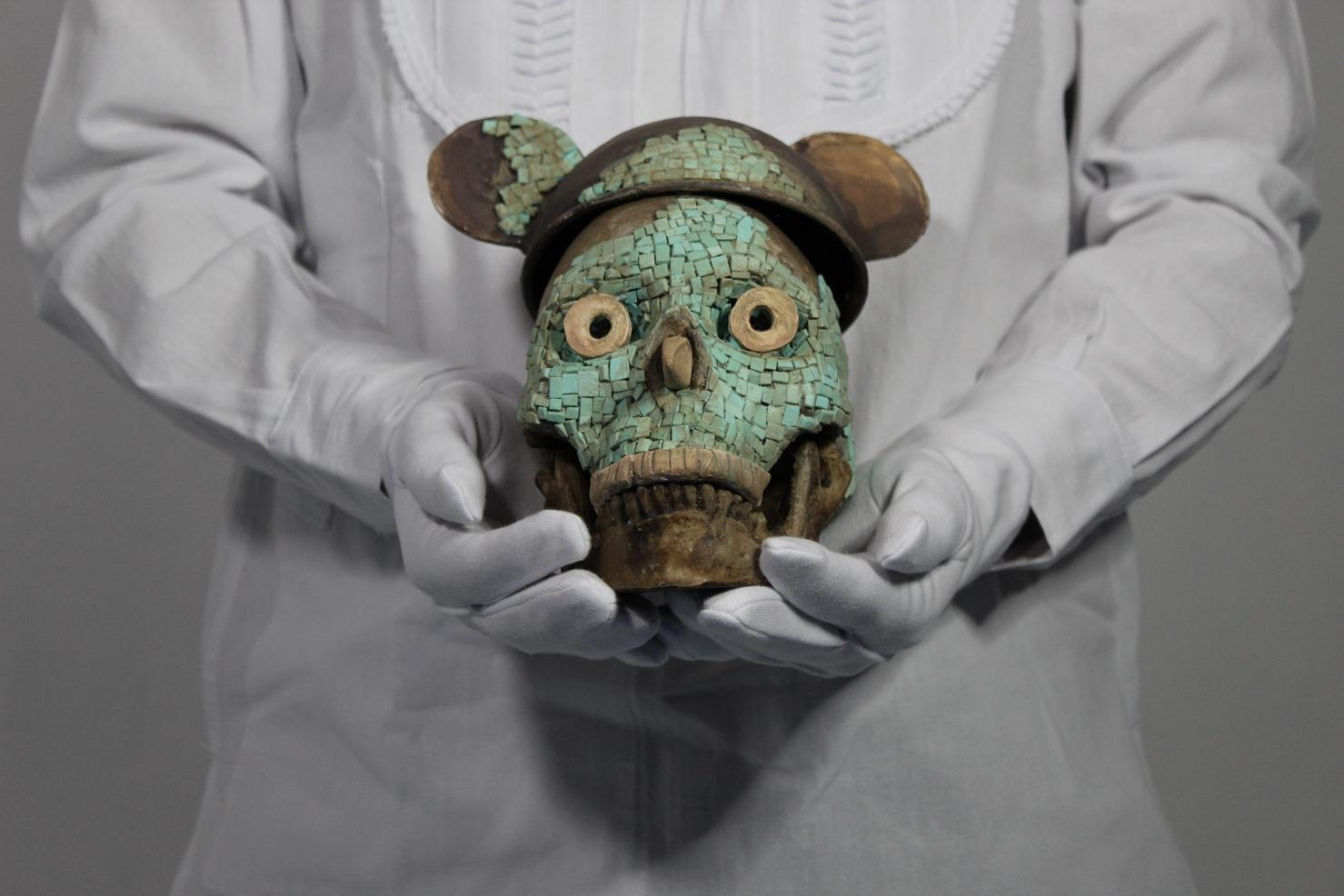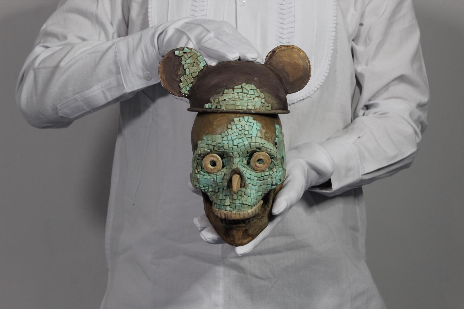 La pieza "Tumba 7" es una reinterpretación del cráneo decorado con turquesa encontrado en dicha tumba. Se le ha colocado un gorro de Mickey Mouse con el mismo tratamiento estético, para evocar cómo las culturas están siendo transfor madas en souvenirs turísticos.