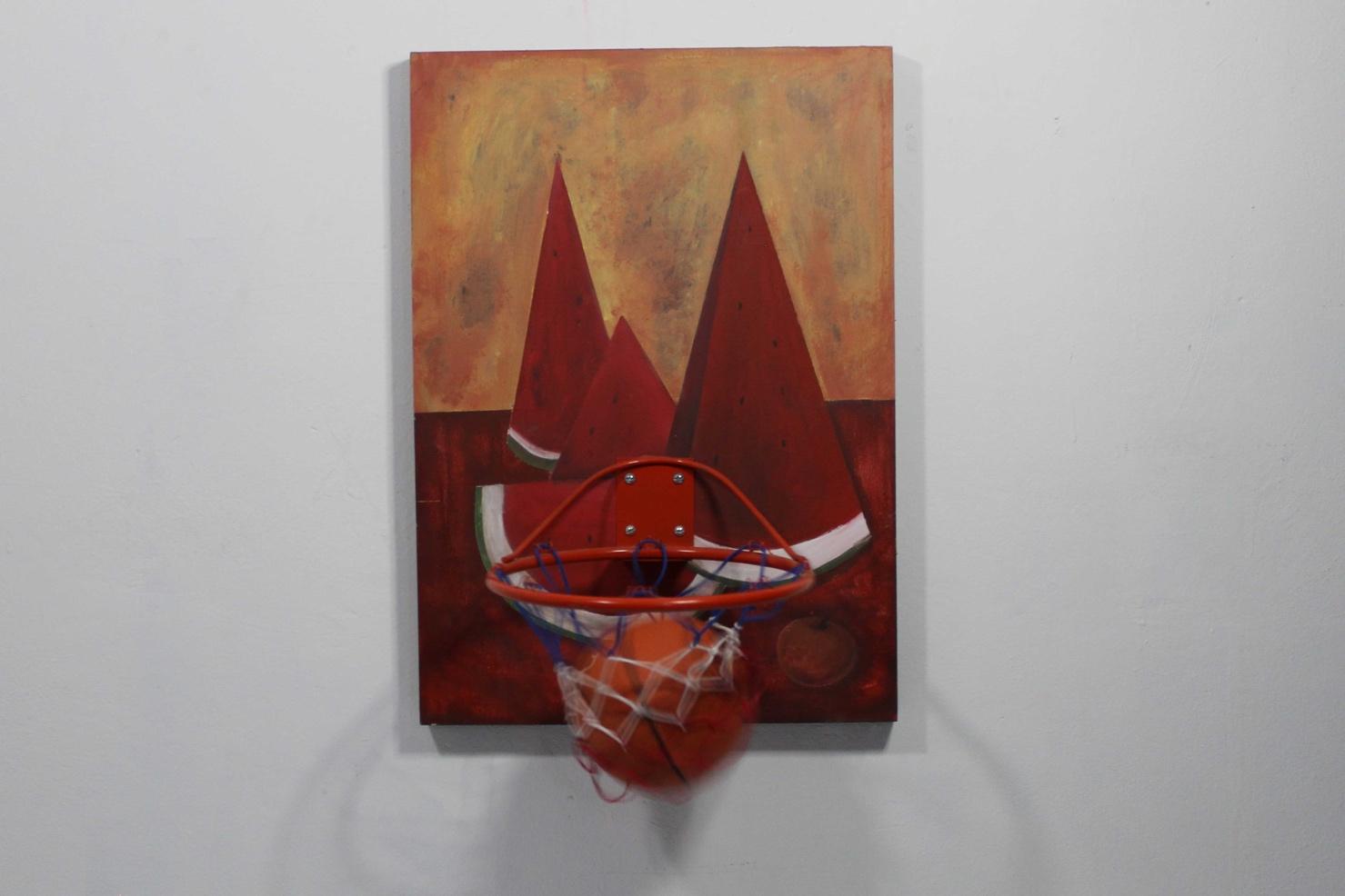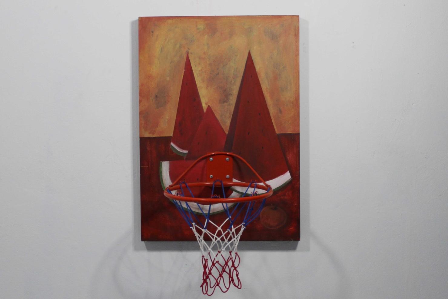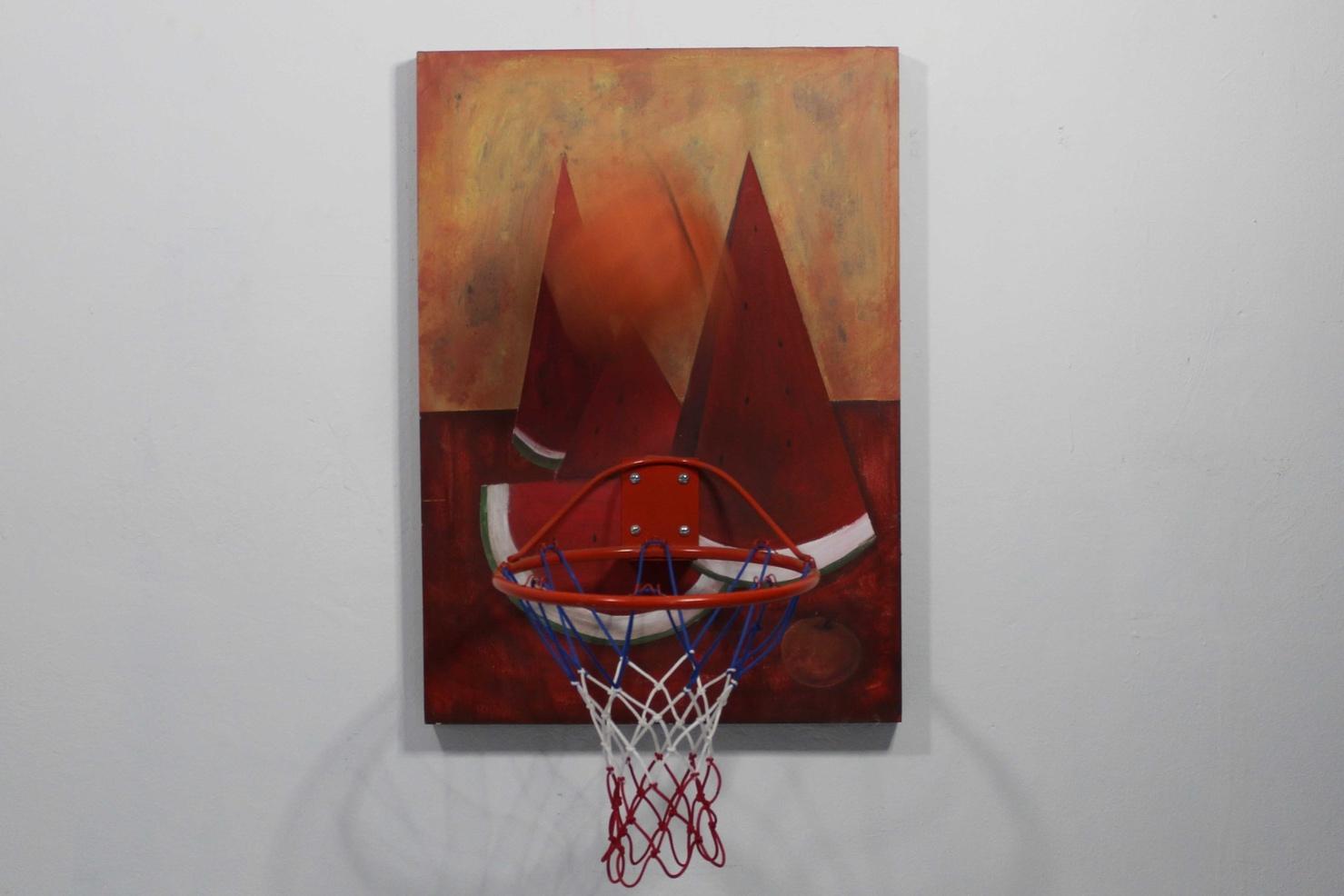 Acrílico sobre madera, canasta de baloncesto, balón de baloncesto