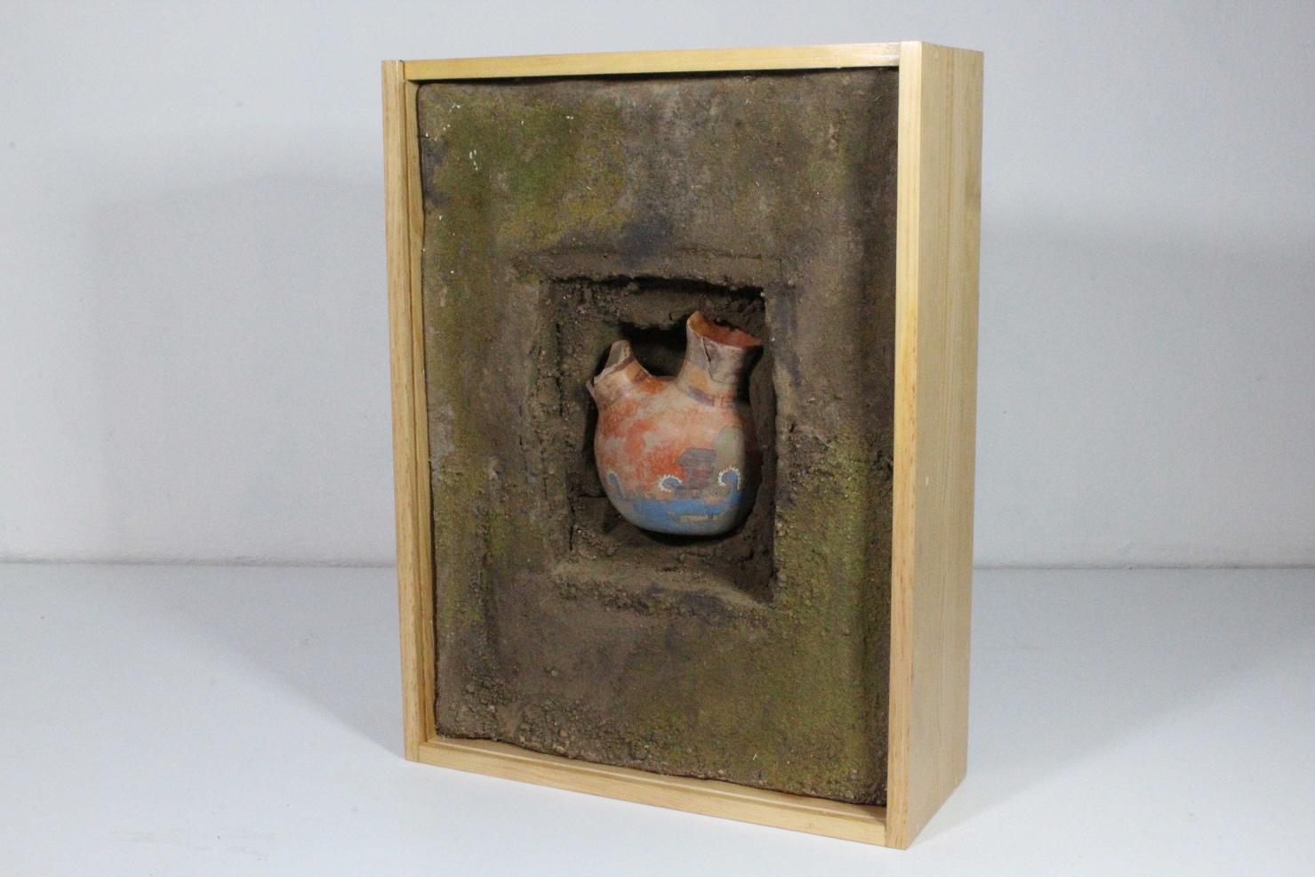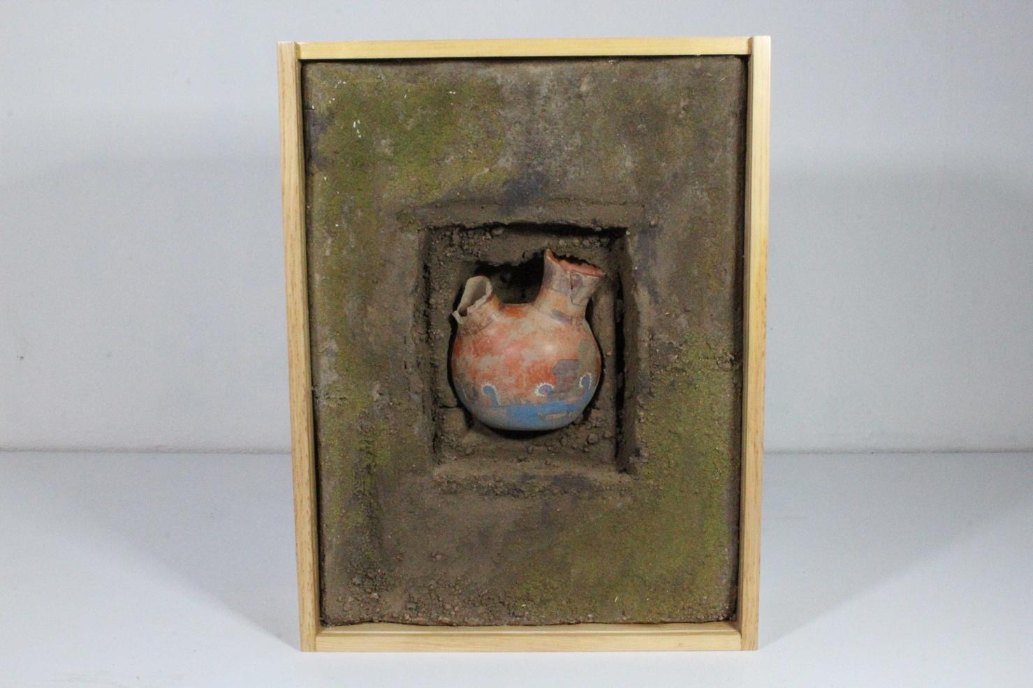 Jarrón barro rojo, pintura acrílica, espuma oasis, tierra, pasto falso, madera 65x49x18 2023