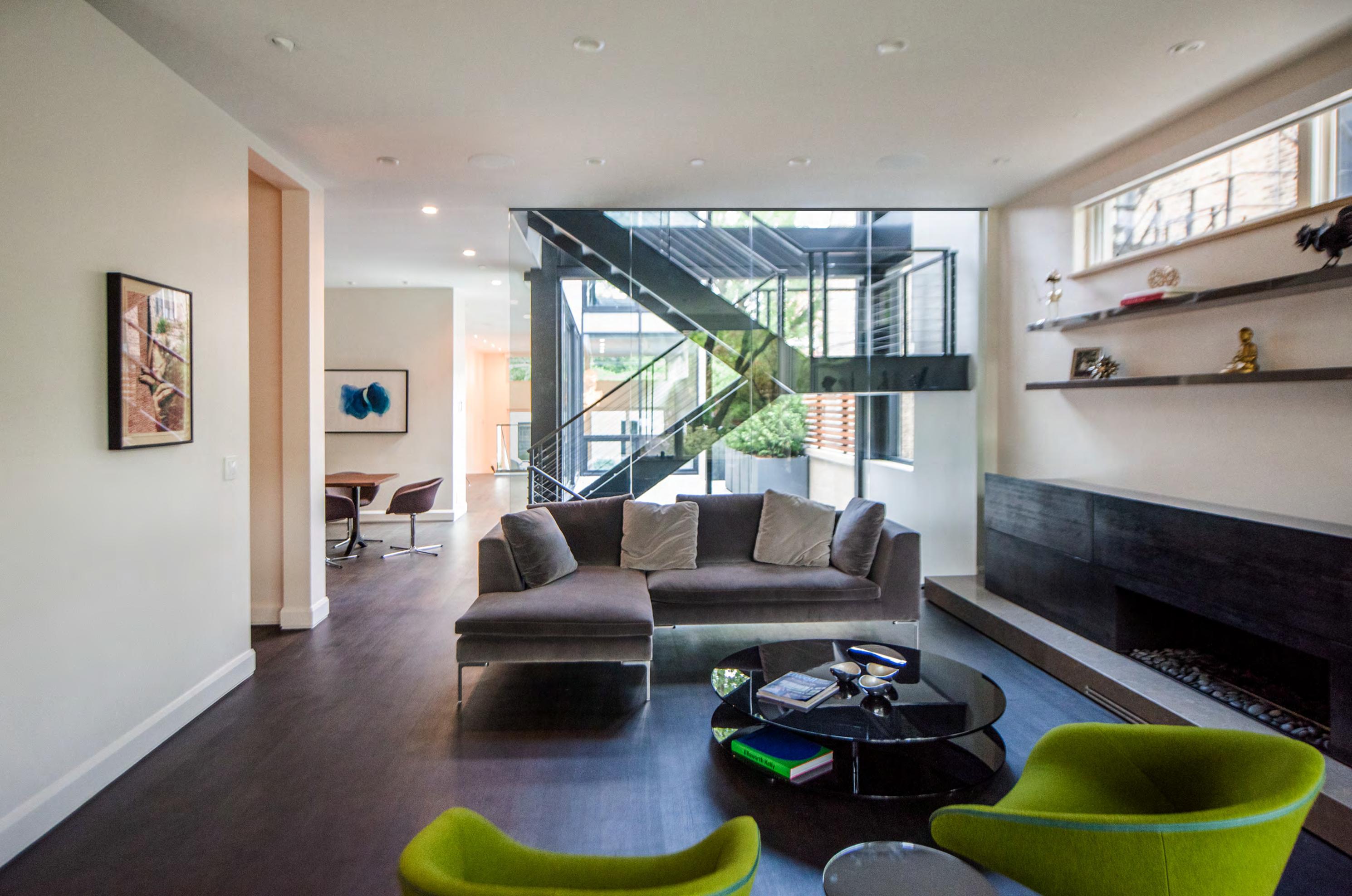 The living room has (4) main features: a steel staircase, a glass panel separation wall, a fireplace and a grand window wrapping the south west corner of the room. This is the first main space you proceed into upon entering the front of the house. It was important this space feel inviting and open. Having the glass separation wall located at the stairwell functions as a guard rail and also allows the living space to be full of natural daylight. The living space is a place of gathering and activity. It was important to feel relaxed and to not have confining opaque walls. The transparency of the glass panel wall allows your line of sight to move through the entire first floor. The window at the southwest corner opens out to a perfect view of a medieval church directly across the street. The fireplace is positioned on the south wall creating a space for lounging. The powder room is connected to the living room and past that you enter into the dining room which continues on to the kitchen/courtyard. All these open spaces are bridged together by a corridor that ultimately leads you down into the family room.