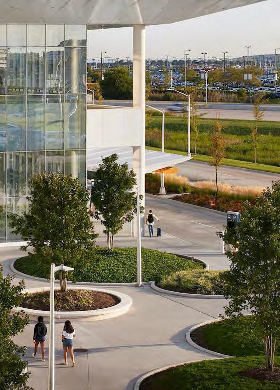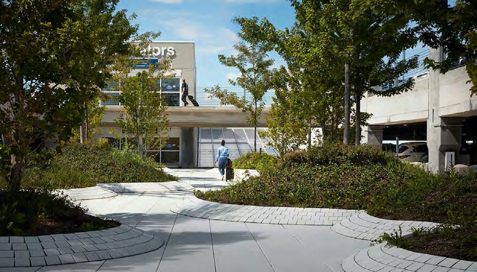 To humanize the structured parking, the facility features two (2) 60-foot wide courtyards planted with evergreen and deciduous trees. The courtyards’ many benefits include providing natural light, ventilation, and wayfinding. The openings aid in orienting the visitor by breaking-up each level of the floor plate into three (3) sections. They act as visual landmarks and an obvious circulation path to the CSC and ATS station. In addition, each courtyard is unique visually to cue individuals to which end of the facility they parked their car. The courtyards are open to sky to help ventilate the parking facility and to provide the plants with sunlight and water while the edges of the courtyards provide a sheltered circulation path in inclement weather. Appropriate plant species shall be chosen for their low maintenance, hardiness and drought resistance. The facility shall include a drainage system to collect stormwater that in turn will feed an irrigation system for the landscaping on site and in the courtyards. Symbolically, the tree-filled courtyards counterbalance the building’s main function of storing automobiles. According to the EPA “driving a private car is probably a typical citizen’s most polluting daily activity.” Cars are major contributors of air pollutants producing 33% of the carbon dioxide (CO2) released into the atmosphere. On the other hand, trees or forests are “the earth’s lungs,” converting carbon dioxide (CO2) to oxygen.