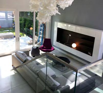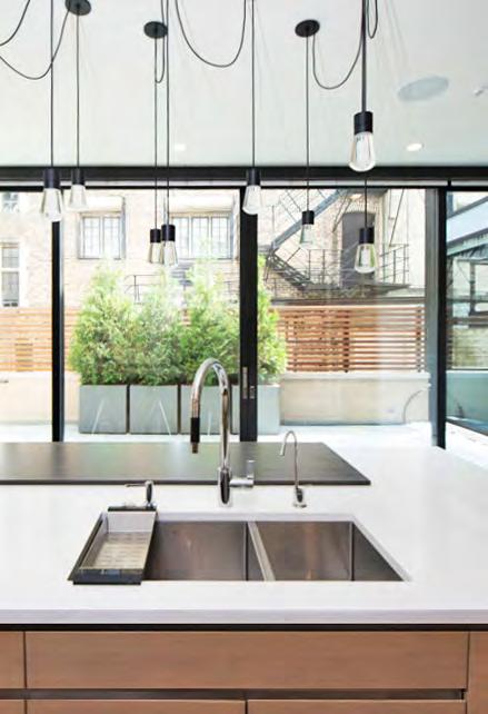 The kitchen centerpiece is a custom designed service island. This service island houses the dishwasher, garbage disposal, soap dispenser, drinking water filtration system, storage and book cases. Installed at the bottom of kitchen island is a “Sweepovac” (under counter kitchen vacuum) for removing debris from the kitchen floor. The millwork design reads as one continuous surface while containing all the appliances including the fridge, freezer and storage. The millwork was designed to have a minimal aesthetic with a warm texture to soften the space. Floating stainless steel shelves were anchored into the stud wall on the north elevation above the cooking counter space. Hafele puck lights were installed underneath the stainless steel shelving units to provide additional lighting. The north wall backsplash is made from two very large pieces of marble with each half measuring at 6’ x 8’. To the south is a double acting sliding glass panel wall. These massive panels are floor to ceiling in height and span the entire width of the courtyard. When opening the sliding panels the kitchen and the outdoor courtyard become one space, blurring the line between the interior and exterior.