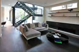 The family room is designed to be a relaxed and playful space. With 15’ ceilings, it is the most open space in the house. There are 3 entry points into the family room: (1) is a stairway leading down from the kitchen (2) is through the sliding glass doors leading in from the back patio and (3) a hidden door built into the millwork by the bookcases; it is a secret passageway with a slide leading into the basement. A custom entertainment center was created to house the TV as well as to provide storage cabinets. Bose speakers are installed throughout the room for surround sound and for music. The family room has a polished concrete floor with radiant heat from the geo thermal heating system. On the west end of the room is a curtain wall with (2) awning windows. On the east end of the room is a pair of sliding doors which open out to the back patio. The back patio has a 36” outdoor gas grill, planter area, outdoor fireplace feature and a lounging space.