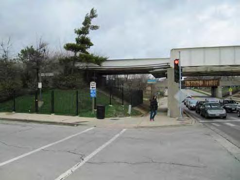 The pedestrian approach from thesouth is along an inclined sidewalk, approximately 5 feet wide along the Des Plaines Avenue bridge over I-290. From the south one must cross the entry ramp road at the crosswalk along the west side of Des Plaines Avenue, however there is no pedestrian crossing signal or traffic signal. From the east side of Des Plaines Avenue, one can cross Des Plaines Avenue at a signaled crosswalk, just north of the south parking entry driveway. The pedestrian approach from the north is along an inclined sidewalk, approximately 5 feet widealong the west side of Des Plaines Avenue. One must cross Des Plaines Avenue at the pedestrian crosswalk at Jackson Boulevard. There is no other pedestrian crossing between Jackson Boulevard and the station entry on Van Buren Street on the north side of the stationhouse.