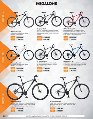 GT Agressor 2.0 26” Aro 26”. Cuadro de aluminio, 21 Vel. Horquilla: Suntour M3020 63 mm. Travel. Frenos Promax Forged Caliper mecanico. Componentes: Shimano Altus/ E. Contado Cuotas 12 x