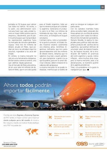 para el Estado Argentino, toda vez que no tenemos buques en la bandera argentina. Generamos el producto, pero no el flete. Los millones de toneladas de soja, trigo, maíz, carne, entre otros, se transporta en buques extranjeros. Contrario sensu, como a la presidente la gusta la aviación, el Estado (todos nosotros) estamos sosteniendo una empresa aérea: Aerolíneas Argentinas, ineficiente, que nos cuesta aproximadamente unos dos millones de dólares diarios, (empresa que no sabemos muy bien a quien pertenece), para transportar a gente rica ya que los pobres, para ver un avión aterrizar o decolar, deben instalarse en la cabecera del aeroparque. La marina mercante no se puede reemplazar, mientras que un boleto de