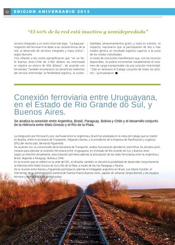 “El 60% de la red está inactiva y semidepredada” servicio integrado a un costo total más bajo. “La baja participación del ferrocarril se debe a las características de la red, al desarrollo de servicios integrales y masa crítica”, según Bonomi. Con relación a los costos ejemplificaron que “en un flete Buenos Aires-Chile de 3.500 dólares vía intermodal se registra un ahorro de 500 dólares”, de acuerdo con Fernández. También enumeraron los beneficios indirectos del servicio intermodal: la flexibilidad logística, la susten-