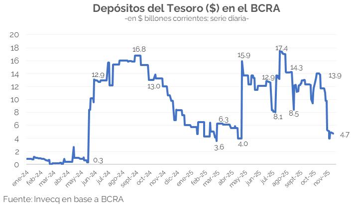 Si bien el monto aún es bajo, preocupa que los depósitos del Tesoro en el BCRA rondan apenas $4,7 bn, mientras enfrenta vencimientos en pesos por $14 bn en lo que resta de noviembre y más de $40 bn en diciembre, lo que lo obliga a depender de un rollover superior al 90%. A esto se suma que el 28 de noviembre vence la restricción de apretón monetario que elevó transitoriamente los encajes del 45% al 50% para contener la volatilidad preelectoral: su finalización podría liberar liquidez al sistema, facilitando un financiamiento mayor.