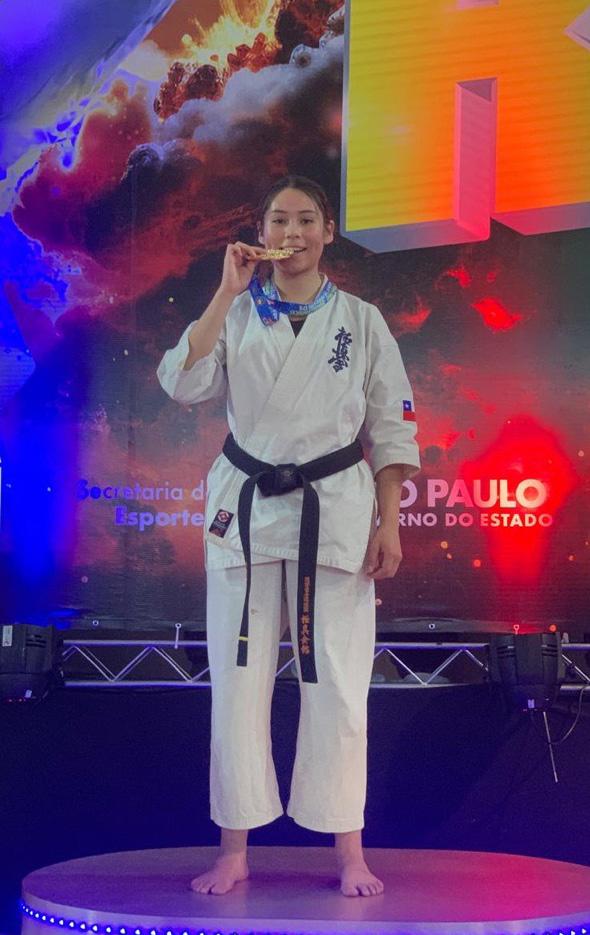 FLORENCIA CARRERA, estudiante de Bachillerato en Ciencias de la Salud en sede Concepción, se coronó campeona de karate en la categoría Damas Expertas Adultas en combate, en el Campeonato Das Américas de Sao Paulo, Brasil.