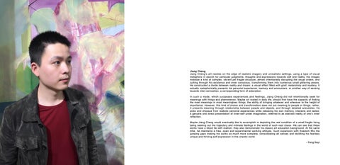 Jiang Cheng Jiang Cheng’s art resides on the edge of realistic imagery and unrealistic settings, using a type of visual metaphors in search for particular judgments, thoughts and expressions towards self and reality. His images mobilize a kind of complex, vibrant yet fragile structure, almost intentionally disrupting the visual orders, and cutting through his existence and inner conscious, transforming them into numerous small glittering pieces. He constructed a divide between reality and dream; a visual effect filled with grief, melancholy and mystery. It actually metaphorically presents his personal experience, memory and encounters, or another way of sensing towards inter-connection, a corresponding form of adsorption. In such a mode, which surpasses experiences and feelings, Jiang Cheng did not intentionally seek for meanings with things and phenomenon. Maybe art rooted in daily life, should first have the capacity of finding the most meanings in most meaningless things; the ability of bringing whatever and wherever to the height of importance. However, this kind of choice and transformation does not put meaning to people or things, rather, it presents meaning through relationship between people and objects, and through detailed anecdotes. He picks and chooses from realistic personal experiences while releasing his own memory, interests and tastes; a genuine and direct presentation of inner-self under imagination, referred to as abstract reality of one’s inner reflection. Maybe Jiang Cheng would eventually like to accomplish is depicting the real condition of a small fragile living being seeking out the trajectory and intimate feelings in the world of such vast chaos. We can see that these works have a blood tie with realism; they also demonstrate his classic art education background. At the same time, he maintains a free, open and experimental working attitude. Such expansion with freedom fills the jumping gaps making his works so much more complete, consolidating all senses and distilling his fearless unique and thriving self-expression in this chaotic world. - Feng Boyi