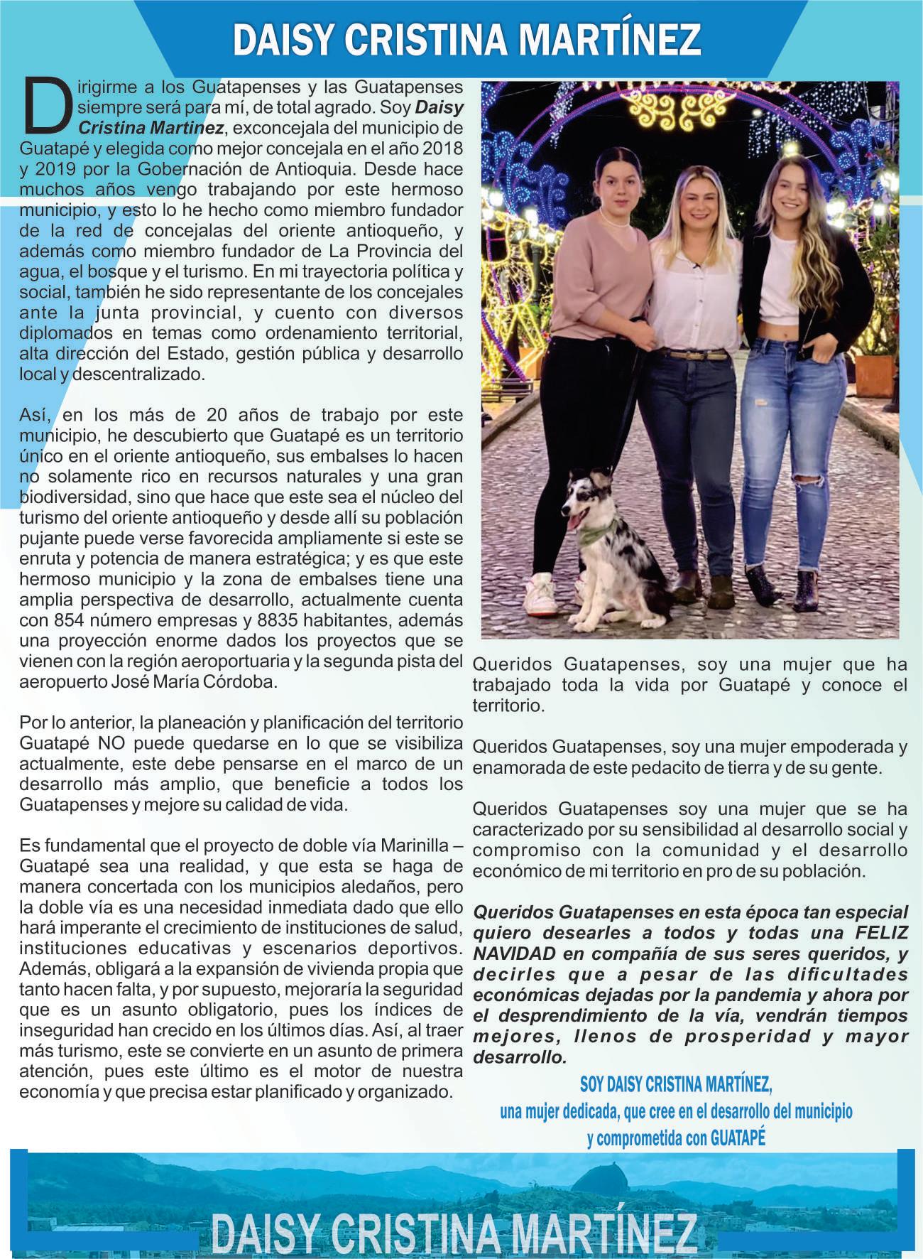 Por lo anterior, iniciaré el proceso de recolección de firmas a través del grupo significativo de ciudadanos denominado “Proyecto Guatapé” con quienes estaré recorriendo las calles y veredas de nuestro terruño, para que su firma, sea el apoyo para iniciar el camino a ser candidata a la alcaldía de Guatapé.