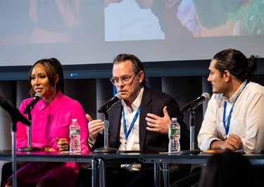RIGHT: JESSE HYDE, EDITOR OF DESERET MAGAZINE WITH PANELIST MARA S. CAMPO (LEFT) AND MODERATOR WESLEY PARNELL (RIGHT).