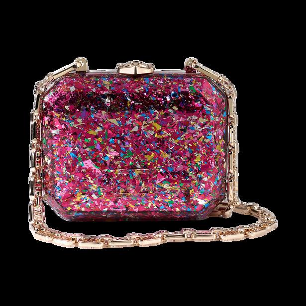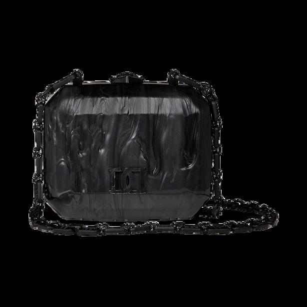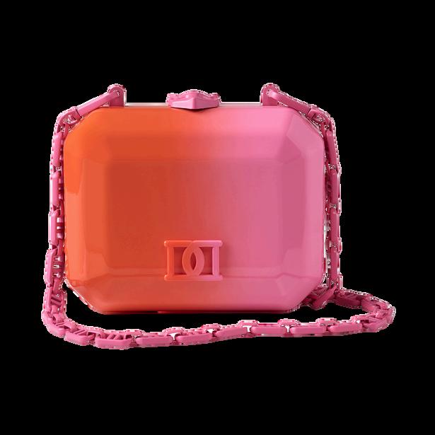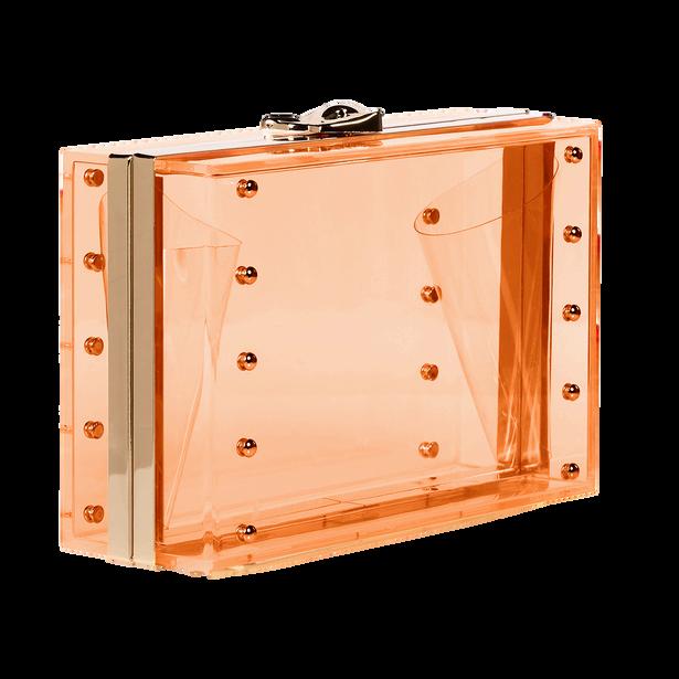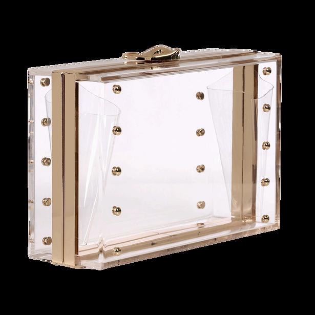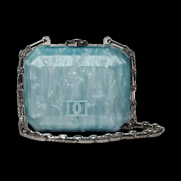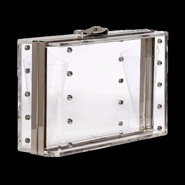 This stylish clutch is made from solid acrylic, making it waterproof and easy to clean It features a detachable DD chain strap and a fox head clasp closure, with clear acrylic side gussets and elegant studded edges Versatile for various occasions, it has a rectangular hard body that offers ample space for essentials like sunglasses and your phone It can be carried as an evening clutch, shoulder bag, handbag, or crossbody