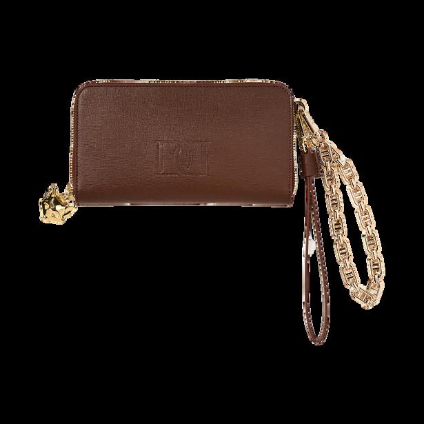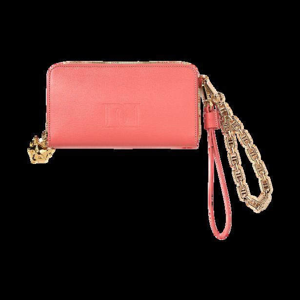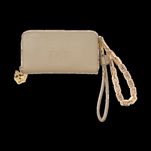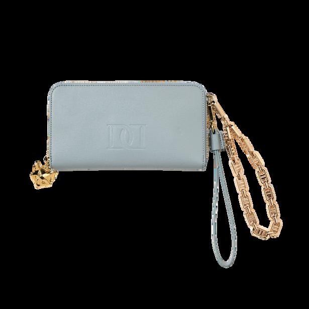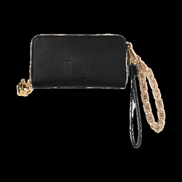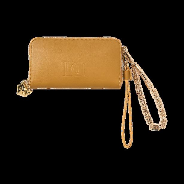 The PARIS clutch, crafted from luxurious Saffiano leather, is perfect for day or evening use It merges wallet functionality with elegant bag appeal, showcasing a stunning DD monogram on the front flap and a sleek gold zipper closure Complete with a leather wristlet, it also pairs beautifully with a signature DESERI chain for versatile styling