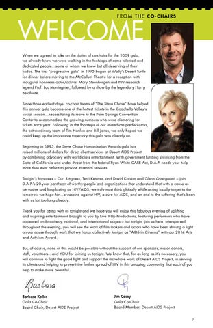When we agreed to take on the duties of co-chairs for the 2009 gala, we already knew we were walking in the footsteps of some talented and dedicated people…some of whom we knew but all deserving of their kudos. The first “progressive gala” in 1995 began at Wally’s Desert Turtle for dinner before moving to the McCallum Theatre for a reception with inaugural honorees actor/activist Mary Steenburgen and HIV research legend Prof. Luc Montagnier, followed by a show by the legendary Harry Belafonte. Since those earliest days, co-chair teams of “The Steve Chase” have helped this annual gala become one of the hottest tickets in the Coachella Valley’s social season…necessitating its move to the Palm Springs Convention Center to accommodate the growing numbers who were clamoring for tickets each year. Following in the footsteps of our immediate predecessors, the extraordinary team of Tim Hanlon and Bill Jones, we only hoped we could keep up the impressive trajectory this gala was already on. Beginning in 1995, the Steve Chase Humanitarian Awards gala has raised millions of dollars for direct client services at Desert AIDS Project by combining advocacy with world-class entertainment. With government funding shrinking from the State of California and under threat from the federal Ryan White CARE Act, D.A.P. needs your help more than ever before to provide essential services. Tonight’s honorees – Curt Ringness, Terri Ketover, and David Kaplan and Glenn Ostergaard – join D.A.P.’s 20-year pantheon of worthy people and organizations that understand that with a cause as pervasive and long-lasting as HIV/AIDS, we truly must think globally while acting locally to get to the tomorrow we hope for…a vaccine against HIV, a cure for AIDS, and an end to the suffering that’s been with us far too long already. Thank you for being with us tonight and we hope you will enjoy this fabulous evening of uplifting and inspiring entertainment brought to you by Live It Up Productions, featuring performers who have appeared on Broadway, national, and international stages – but tonight join us here. Interspersed throughout the evening, you will see the work of film makers and actors who have been shining a light on our cause through work that we honor collectively tonight as “AIDS in Cinema” with our 2014 Arts and Activism Award. But, of course, none of this would be possible without the support of our sponsors, major donors, staff, volunteers…and YOU for joining us tonight. We know that, for as long as it’s necessary, you will continue to fight the good fight and support the incredible work of Desert AIDS Project, in serving its clients and helping to prevent the further spread of HIV in this amazing community that each of you help to make more beautiful.