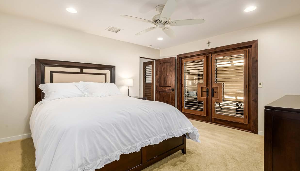 The spacious primary suite offers a serene escape with direct access to the backyard and pool. A sitting area provides the perfect spot to unwind, while the ensuite bath features dual vanities, a walk-in shower, and a soaking tub framed by a picture window. Designed for both relaxation and convenience, this retreat blends comfort with timeless style.