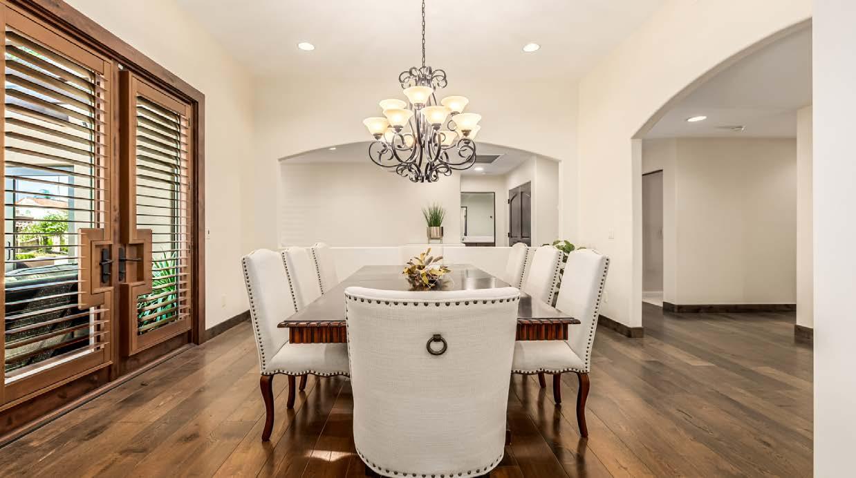 The formal dining room, located just off the entry, sets the tone for refined entertaining with its classic chandelier, rich wood floors, and elegant seating for family and guests. Complementing this space is the bright and inviting casual dining area near the kitchen, featuring built-in bench seating and expansive windows that frame views to the backyard. Together, these dining spaces offer both sophistication and comfort for every occasion.