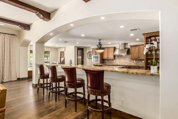 This inviting great room is the heart of the home, featuring soaring beamed ceilings, rich wood flooring, and an open flow that seamlessly connects living, dining, and kitchen spaces. A wall of glass doors frames views of the lush backyard while filling the room with natural light, creating the perfect setting for both everyday living and elegant entertaining.