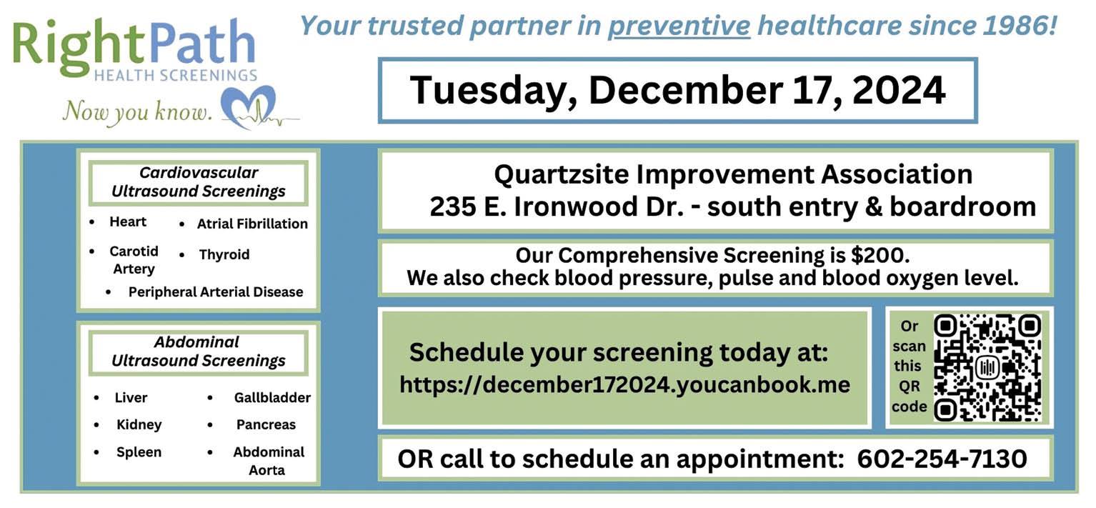 The Quartzsite Chamber of Commerce will host the 22nd Annual Christmas Light Parade 7pm Saturday, December 14th, 2024. The theme this year is “Shining Bright in Quartzsite.” Free entry! Pick up an application at Chamber of Commerce, 79 W. Main St., Quartzsite, or Town Hall. You can also download from Facebook or at QZCOC.ORG.