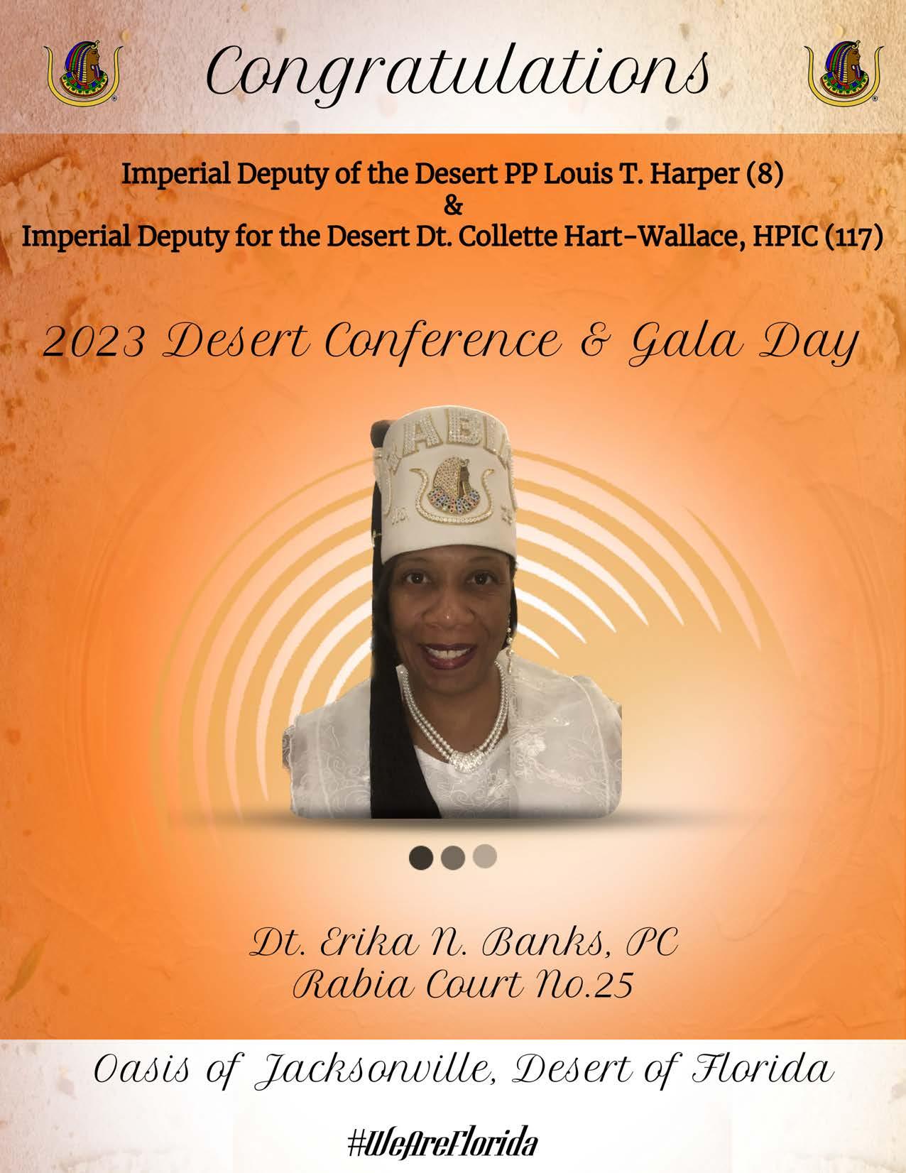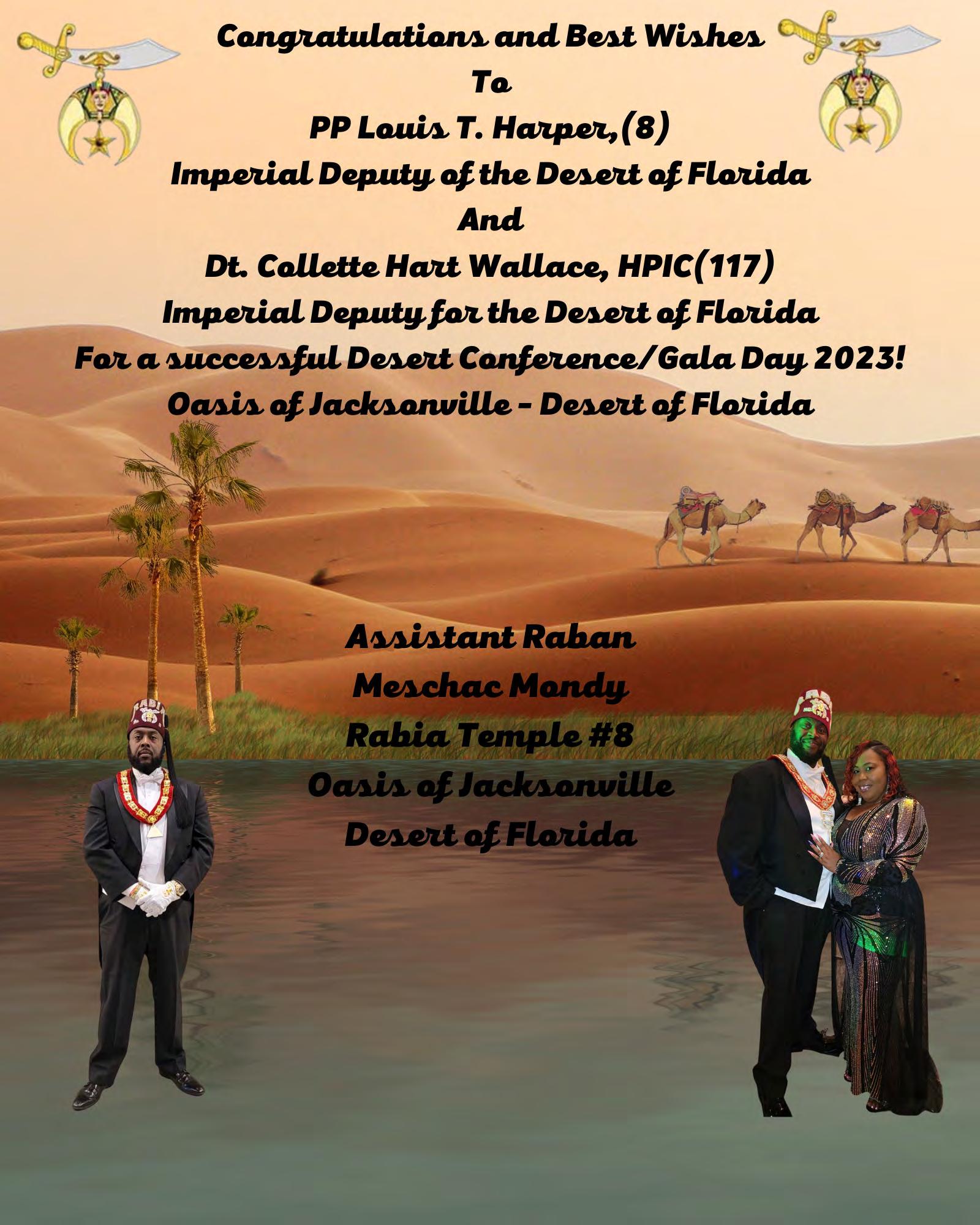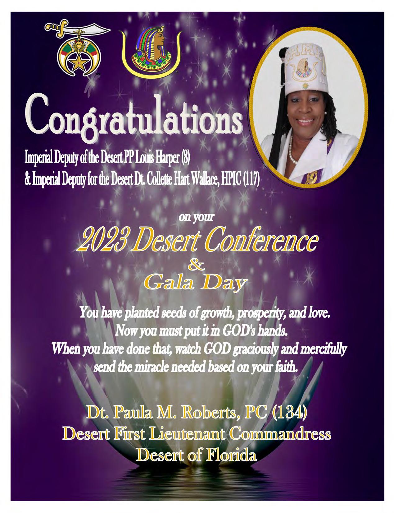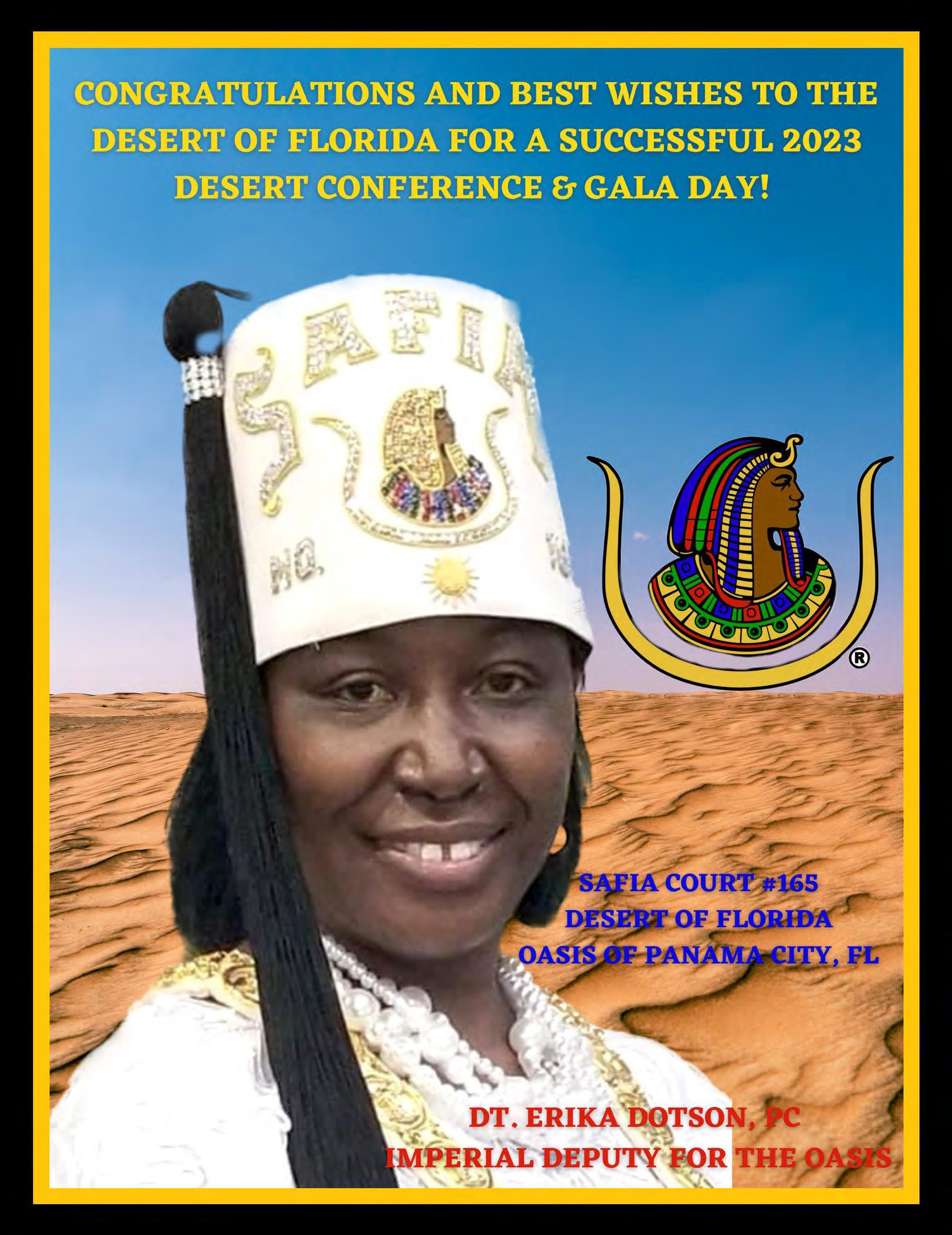 To all the Elected Imperial Council/Court Officers, Appointed Imperial Council/Court Officers, Illustrious Potentates and Illustrious Commandresses, Desert of Florida Nobles and Daughters, Desert Youth, and all the visiting Nobles and Daughters who have traveled to the Desert of Florida to celebrate our Desert of Florida Desert Conference/Gala Day 2023, thank you for supporting the Desert of Florida Desert Conference/Gala Day 2023.