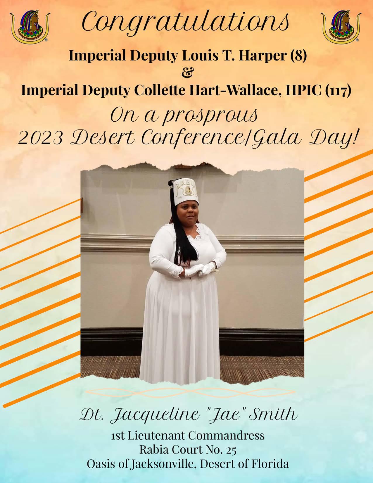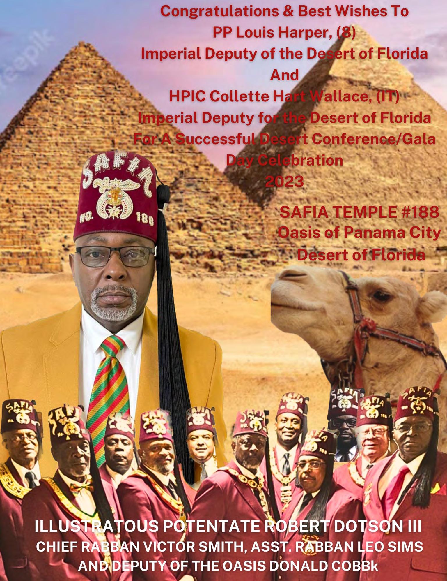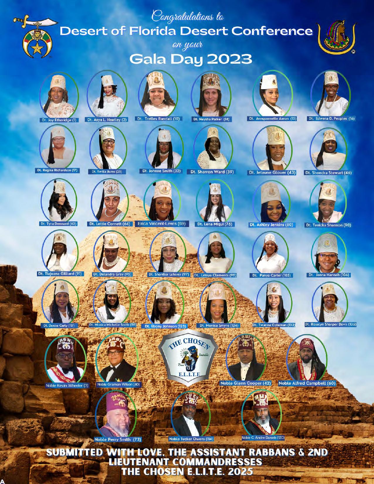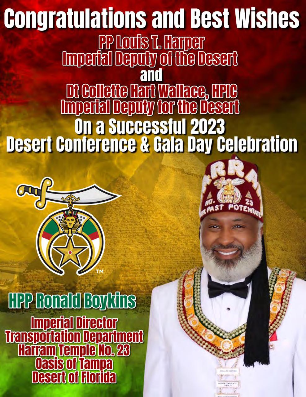 To all the Elected Imperial Council/Court Officers, Appointed Imperial Council/Court Officers, Illustrious Potentates and Illustrious Commandresses, Desert of Florida Nobles and Daughters, Desert Youth, and all the visiting Nobles and Daughters who have traveled to the Desert of Florida to celebrate our Desert of Florida Desert Conference/Gala Day 2023, thank you for supporting the Desert of Florida Desert Conference/Gala Day 2023.