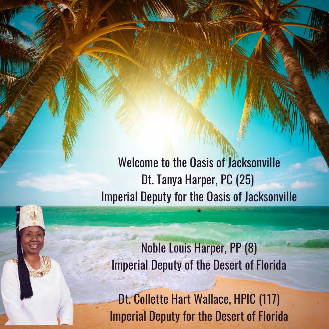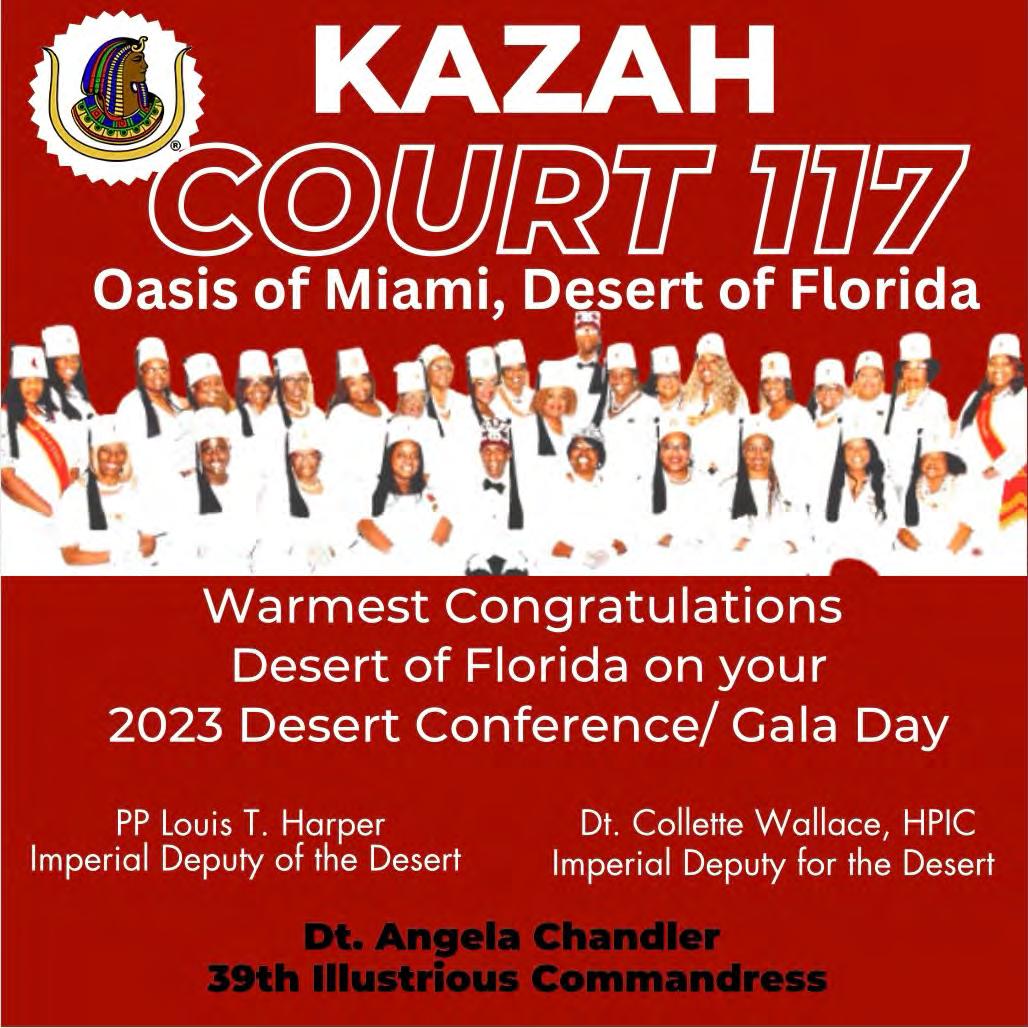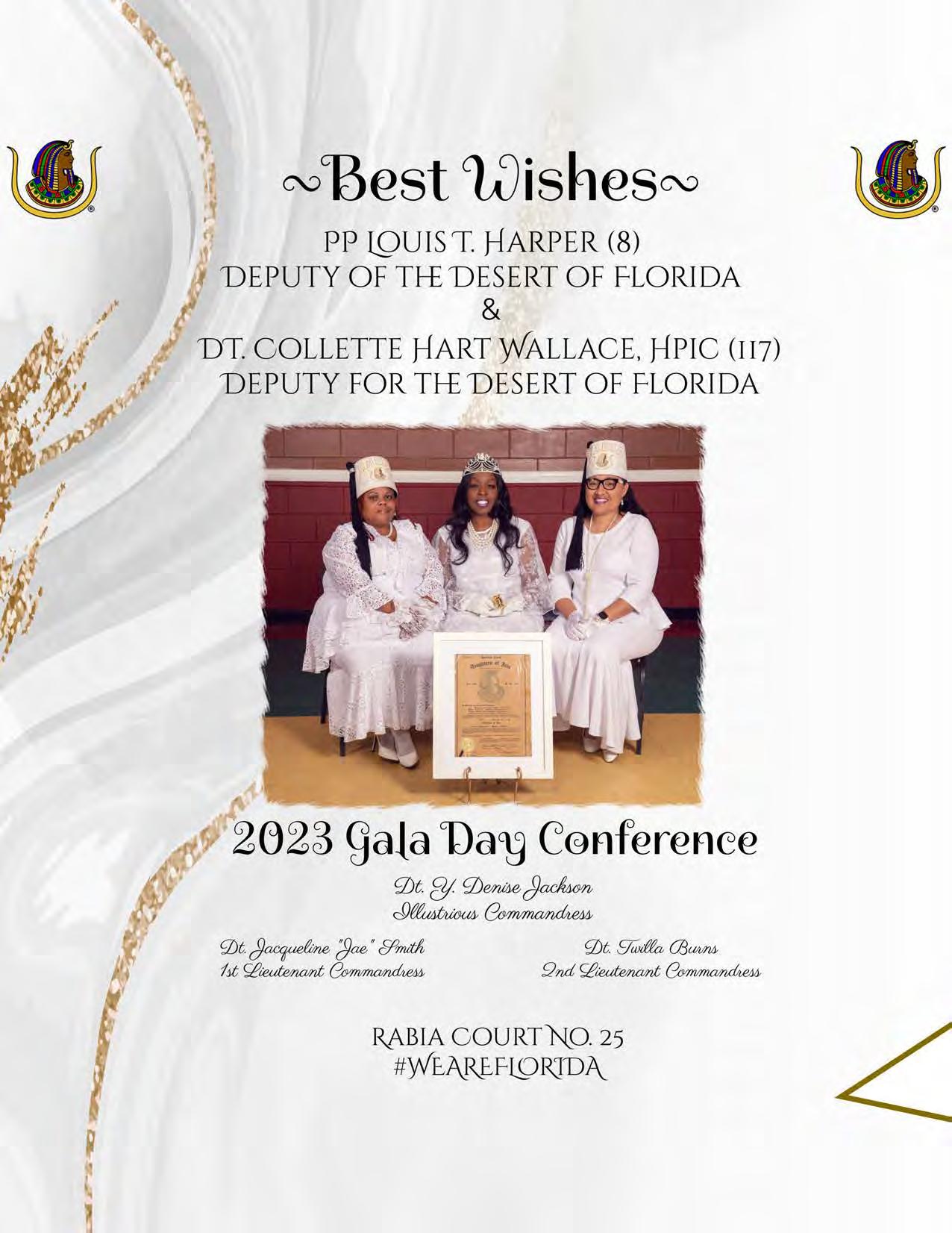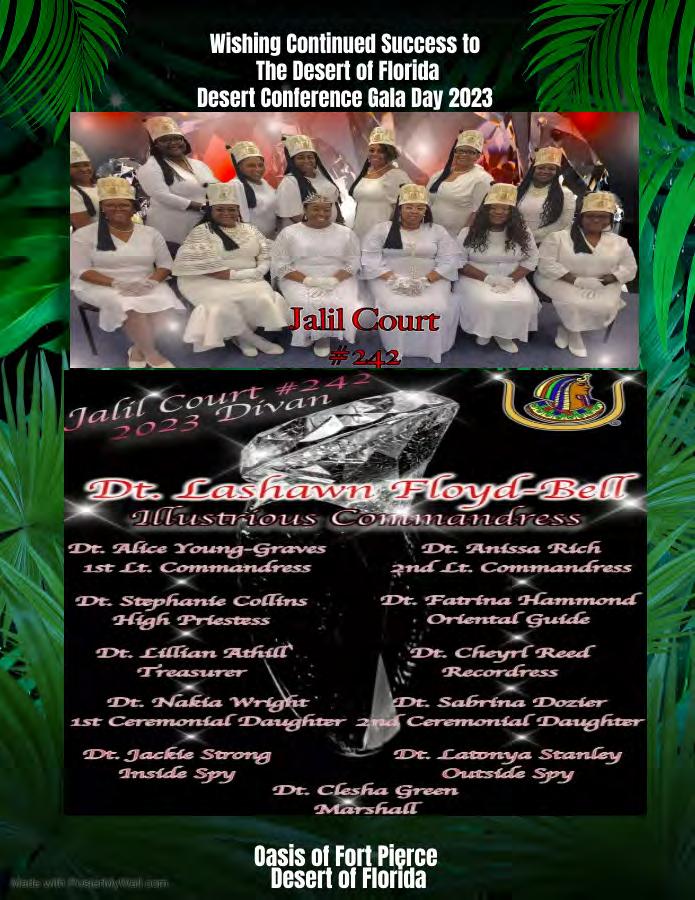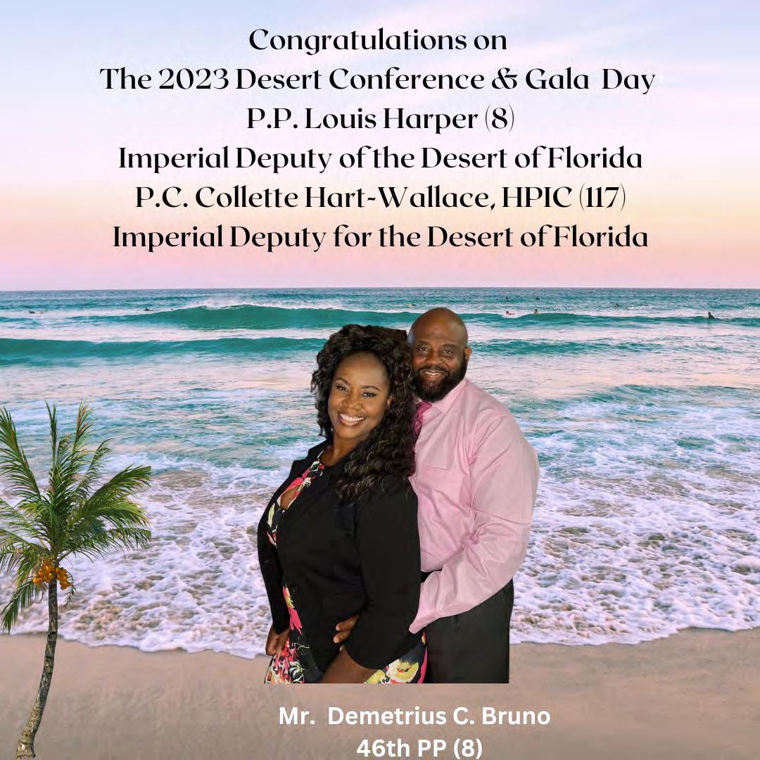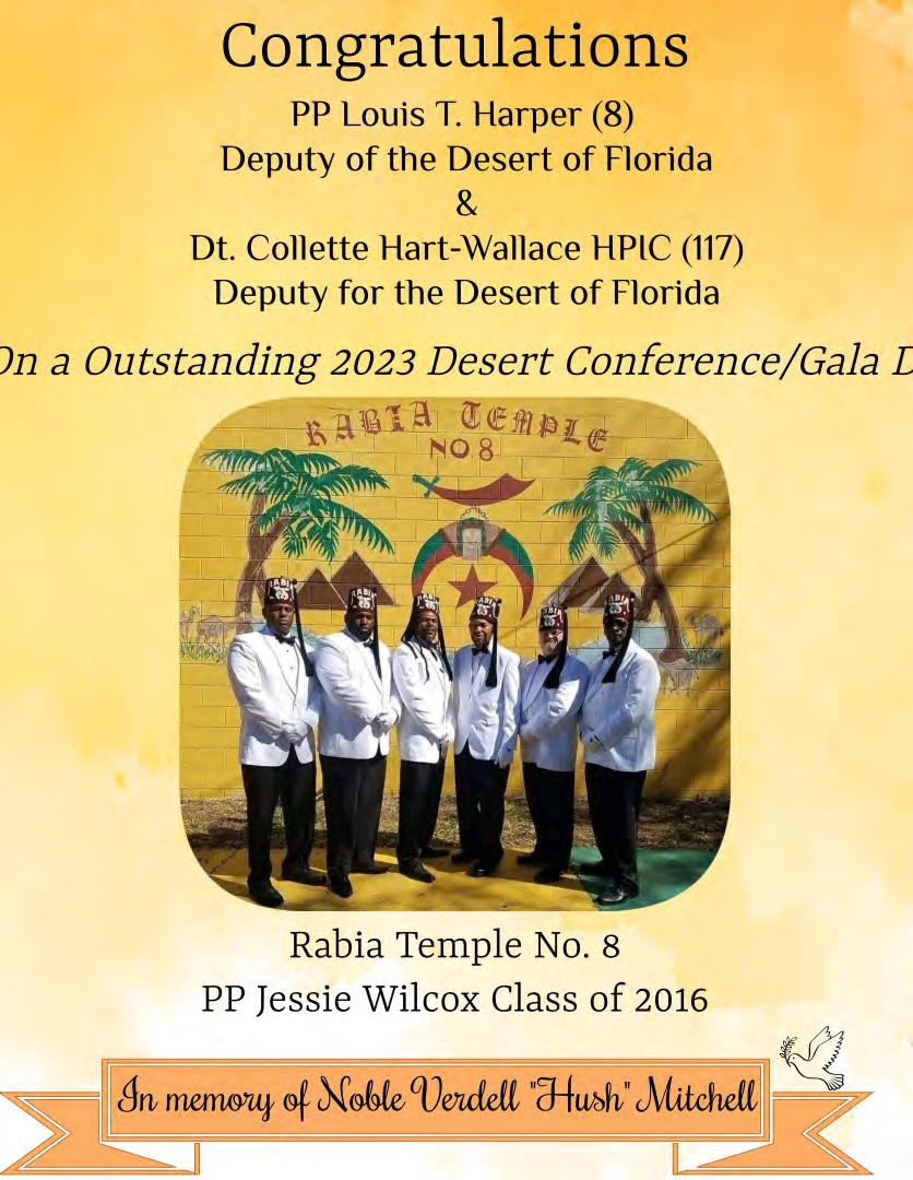 in the Lord with all thine heart And lean not unto thine own understanding. In all thy ways acknowledge him, And he shall direct thy paths. Proverbs 3:5-6 Congratulations on a Successful, Rewarding & Blessed Gala Day Imperial Deputy of the Desert of Florida PP Louis T. Harper (8) & Imperial Deputy for the Desert of Florida Dt. Collette Hart Wallace (117) With Blessings Extended To Rabia Temple #8 Rabia Court #25 Dt. Marva Adell Murray, PC Recordress Daughter of the Year 2023 Osiris Court #70 Oasis of Melbourne Desert Executive Board/Budget Finance Committee Dt. Marva Adell Murray, PC # 70, (Chair) Dt. Lila Gaston, HPC #117 Dt. Laureatte Scott, PC #134 Dt. Sandra Trotter, PC #99 Dt. Sharolyn Turner #117 Daughters Desert Convention Chair