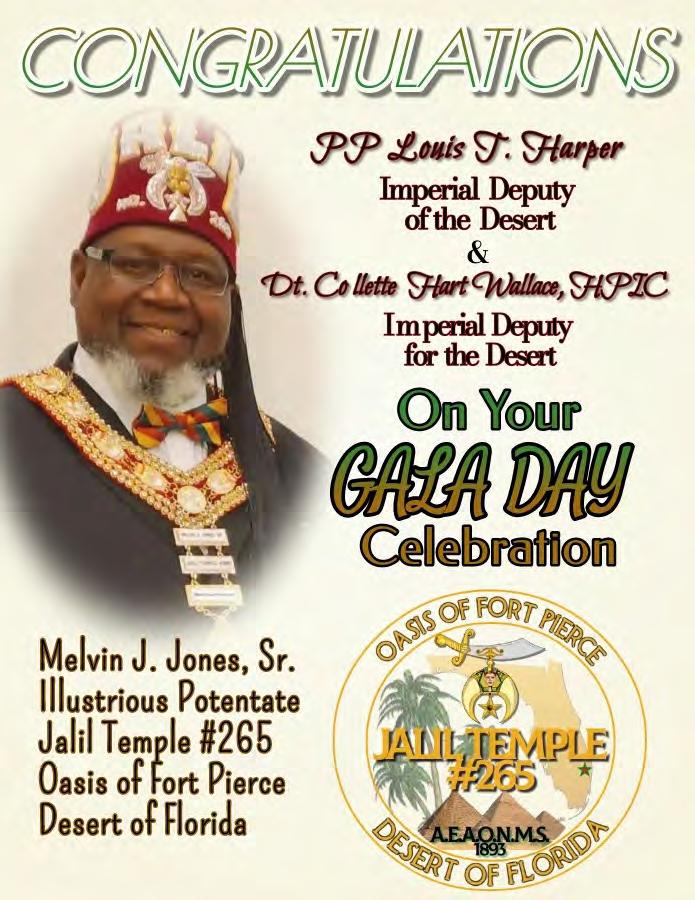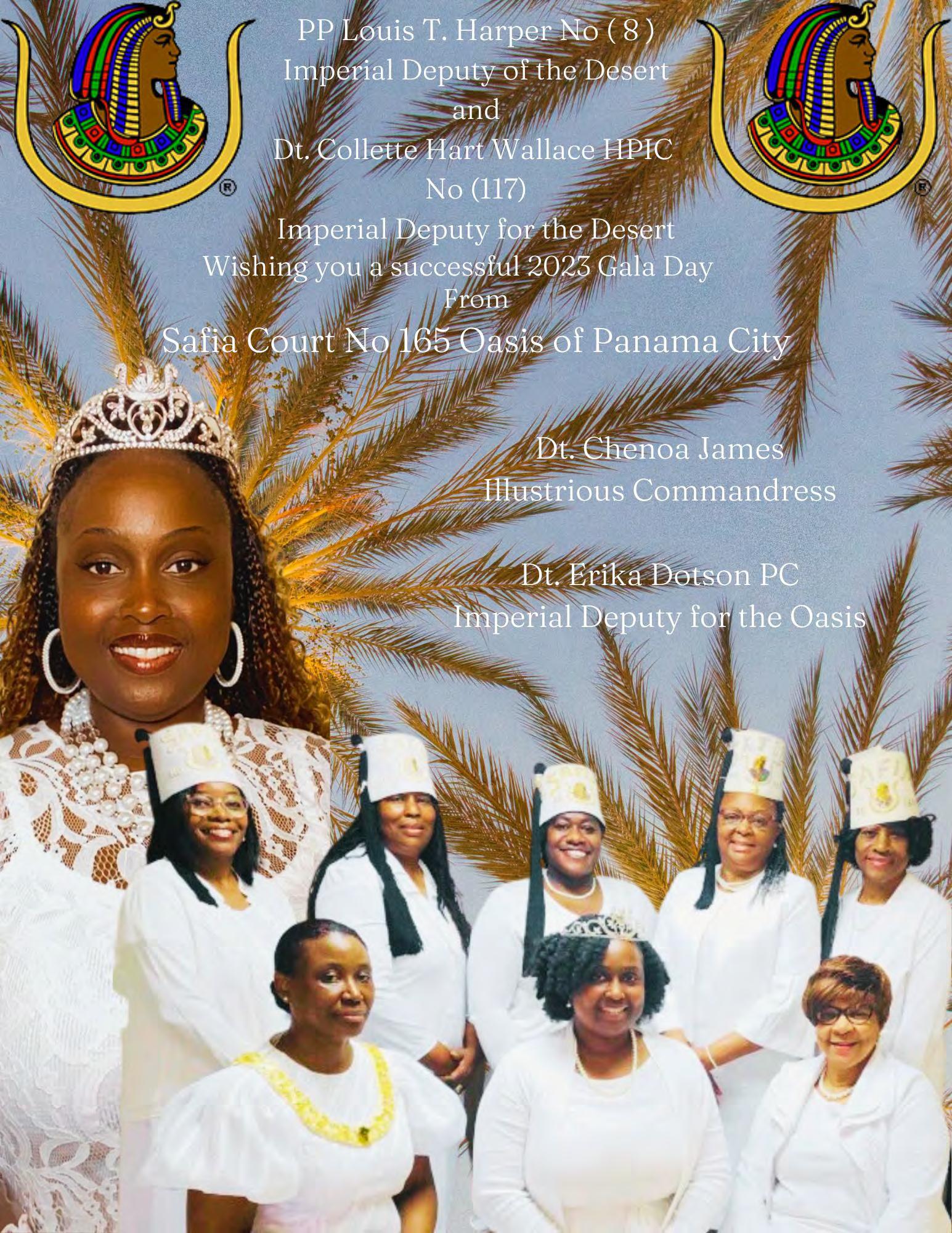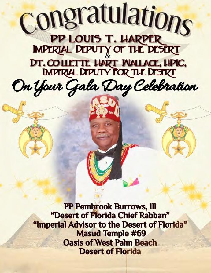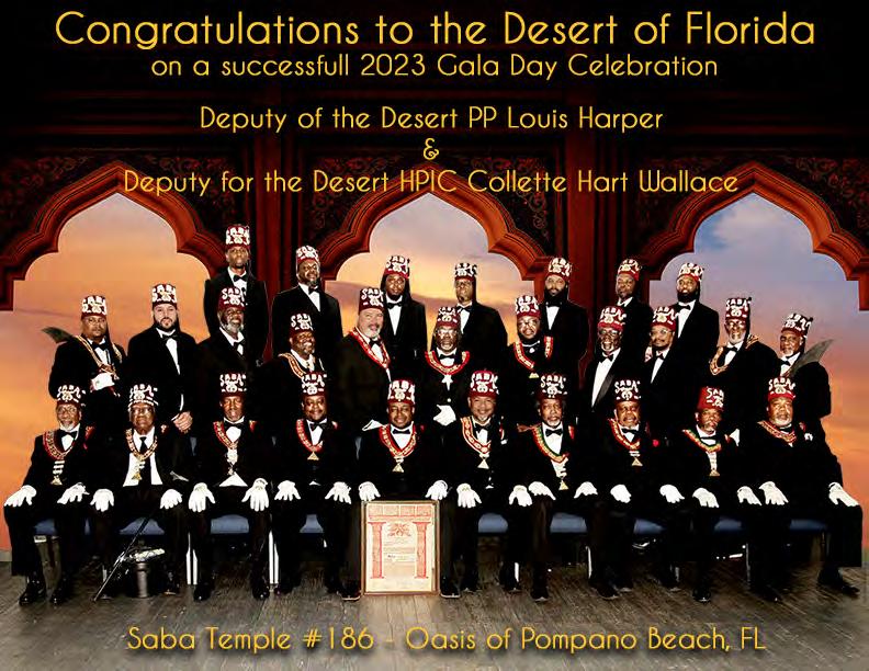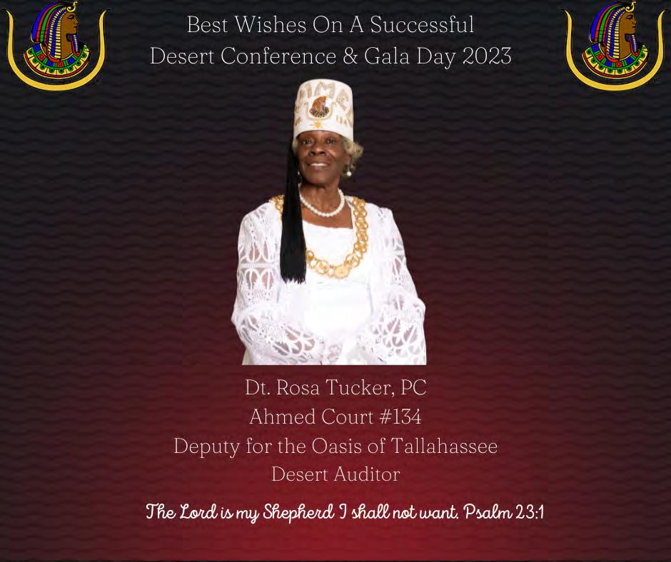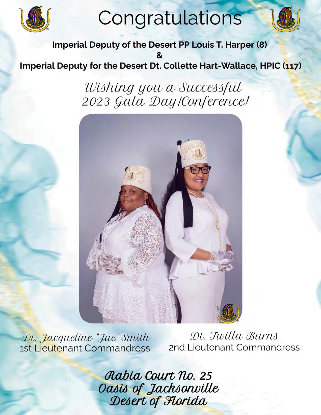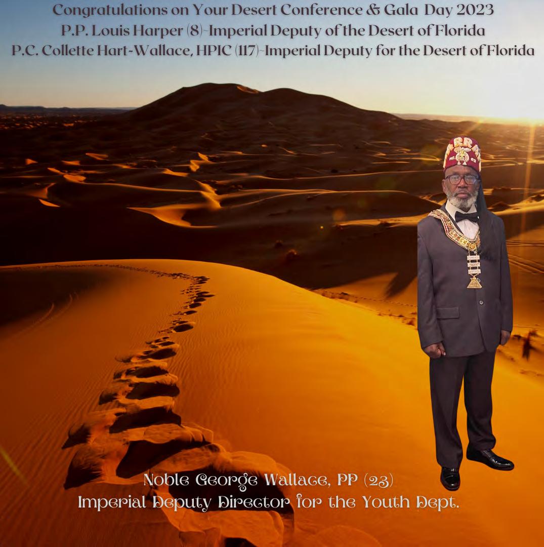 in the Lord with all thine heart And lean not unto thine own understanding. In all thy ways acknowledge him, And he shall direct thy paths. Proverbs 3:5-6 Congratulations on a Successful, Rewarding & Blessed Gala Day Imperial Deputy of the Desert of Florida PP Louis T. Harper (8) & Imperial Deputy for the Desert of Florida Dt. Collette Hart Wallace (117) With Blessings Extended To Rabia Temple #8 Rabia Court #25 Dt. Marva Adell Murray, PC Recordress Daughter of the Year 2023 Osiris Court #70 Oasis of Melbourne Desert Executive Board/Budget Finance Committee Dt. Marva Adell Murray, PC # 70, (Chair) Dt. Lila Gaston, HPC #117 Dt. Laureatte Scott, PC #134 Dt. Sandra Trotter, PC #99 Dt. Sharolyn Turner #117 Daughters Desert Convention Chair