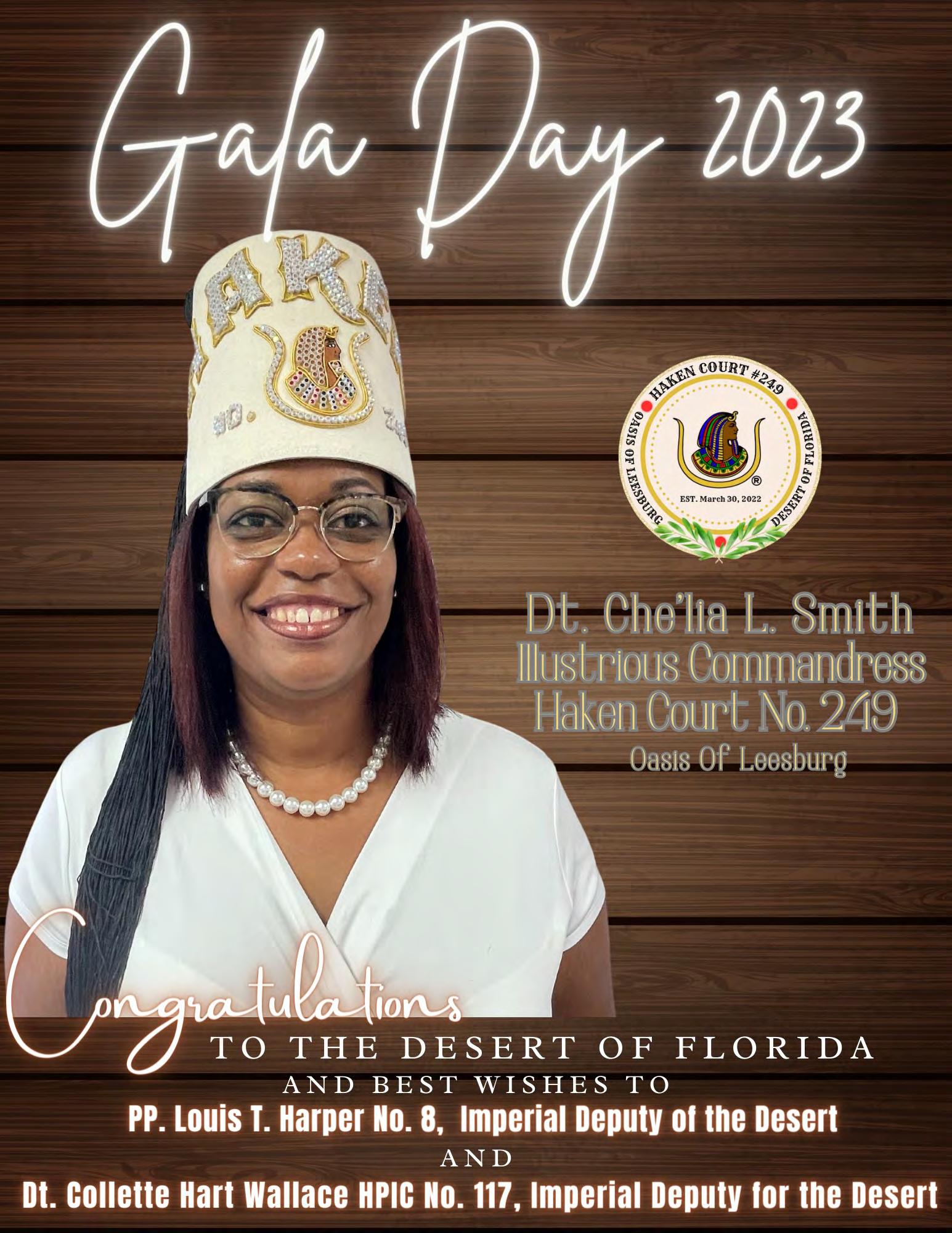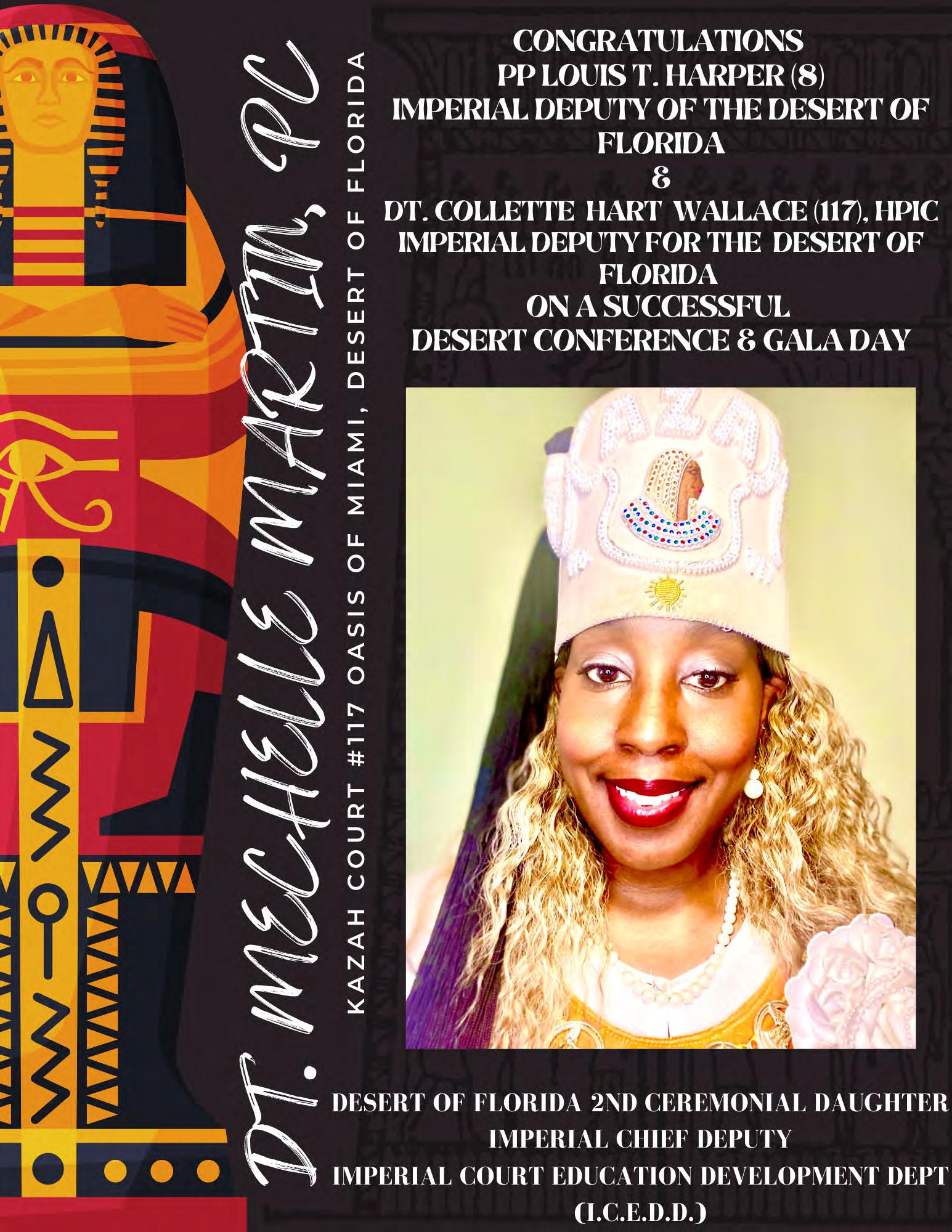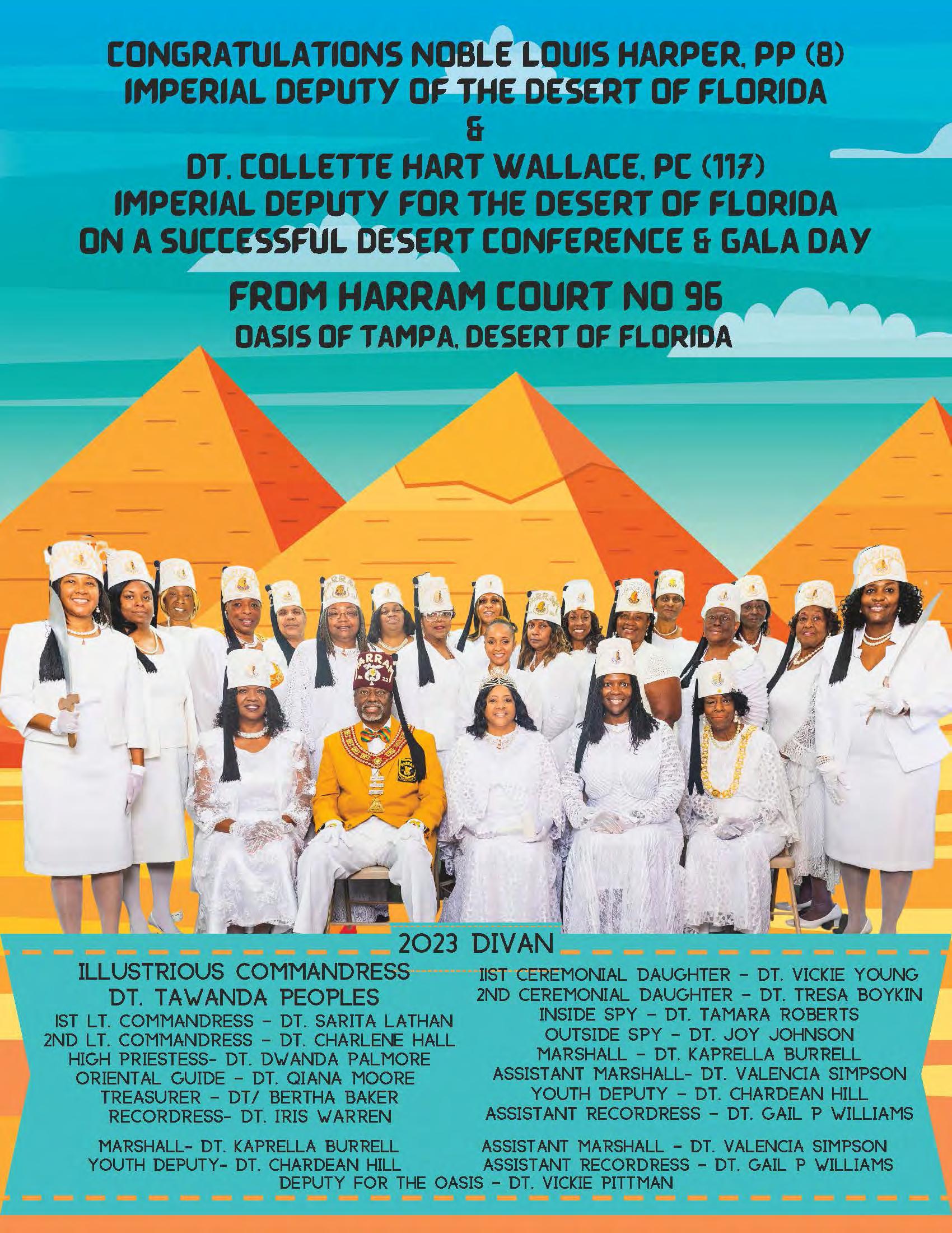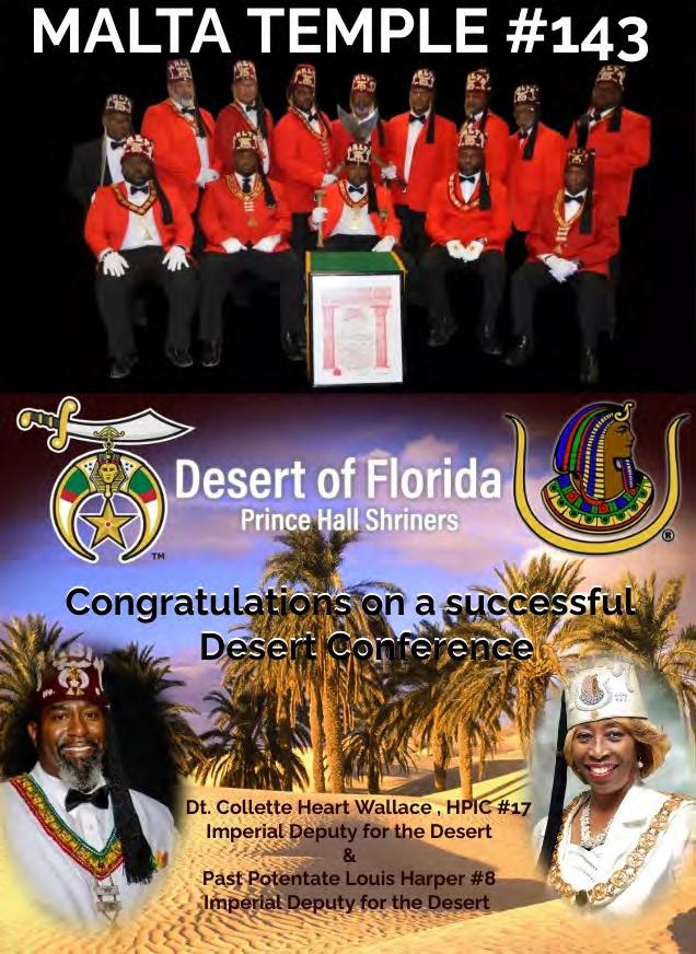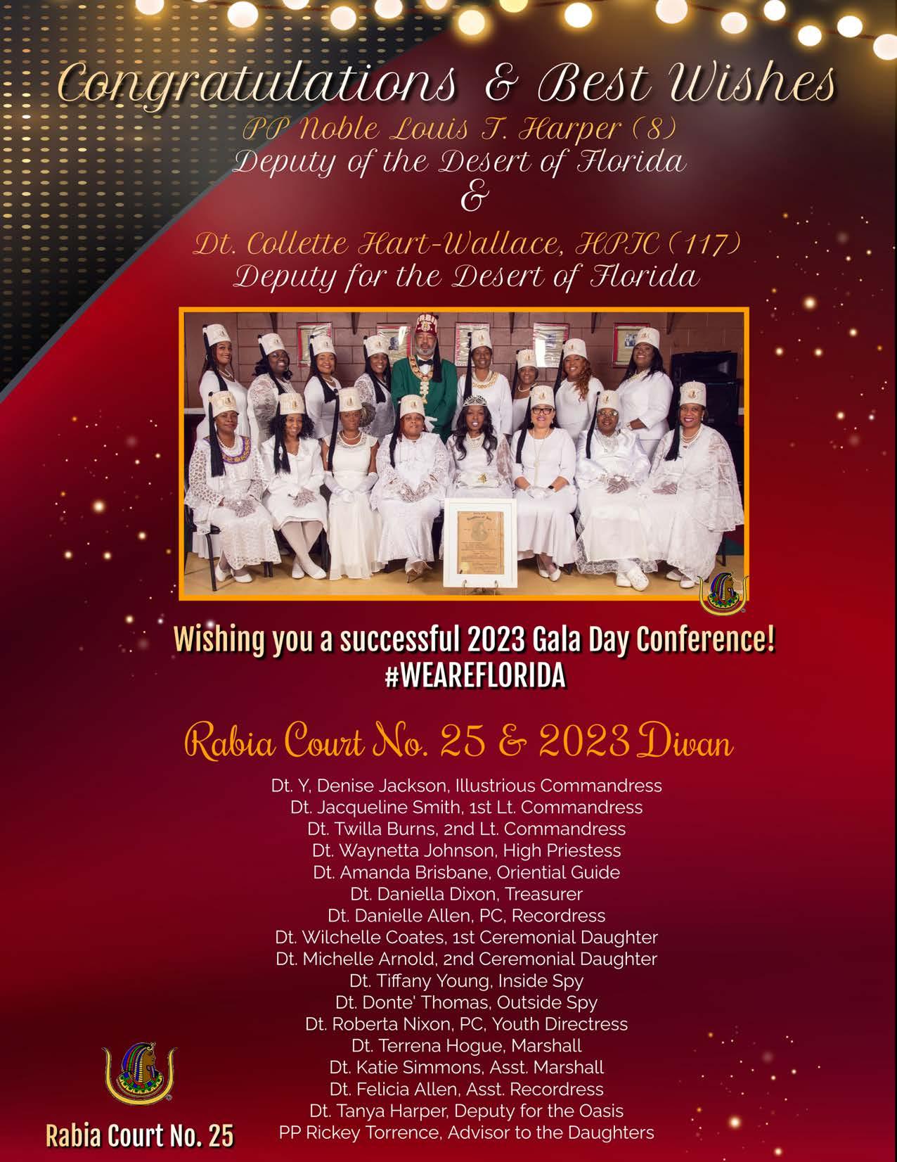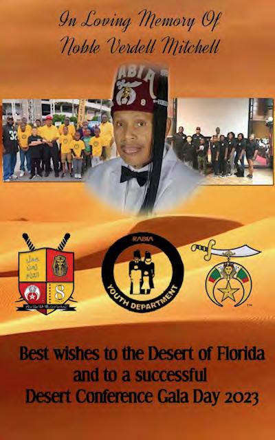 in the Lord with all thine heart And lean not unto thine own understanding. In all thy ways acknowledge him, And he shall direct thy paths. Proverbs 3:5-6 Congratulations on a Successful, Rewarding & Blessed Gala Day Imperial Deputy of the Desert of Florida PP Louis T. Harper (8) & Imperial Deputy for the Desert of Florida Dt. Collette Hart Wallace (117) With Blessings Extended To Rabia Temple #8 Rabia Court #25 Dt. Marva Adell Murray, PC Recordress Daughter of the Year 2023 Osiris Court #70 Oasis of Melbourne Desert Executive Board/Budget Finance Committee Dt. Marva Adell Murray, PC # 70, (Chair) Dt. Lila Gaston, HPC #117 Dt. Laureatte Scott, PC #134 Dt. Sandra Trotter, PC #99 Dt. Sharolyn Turner #117 Daughters Desert Convention Chair