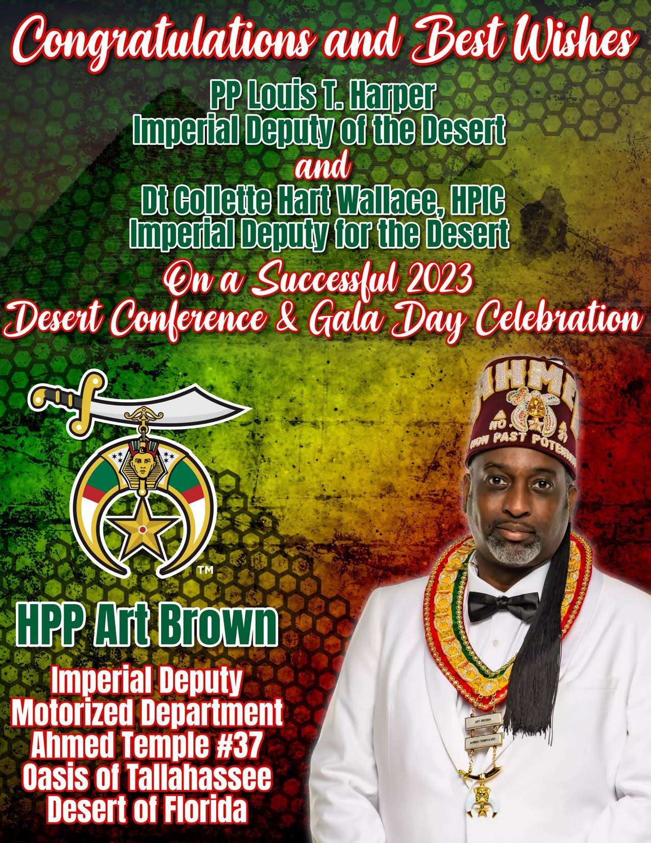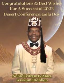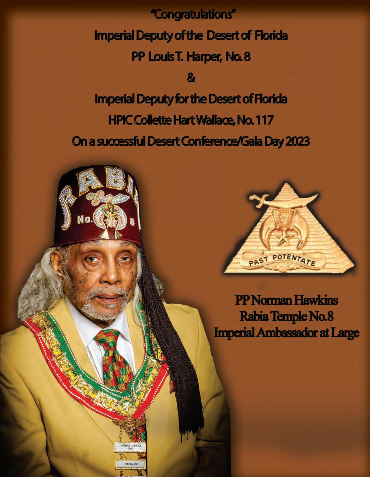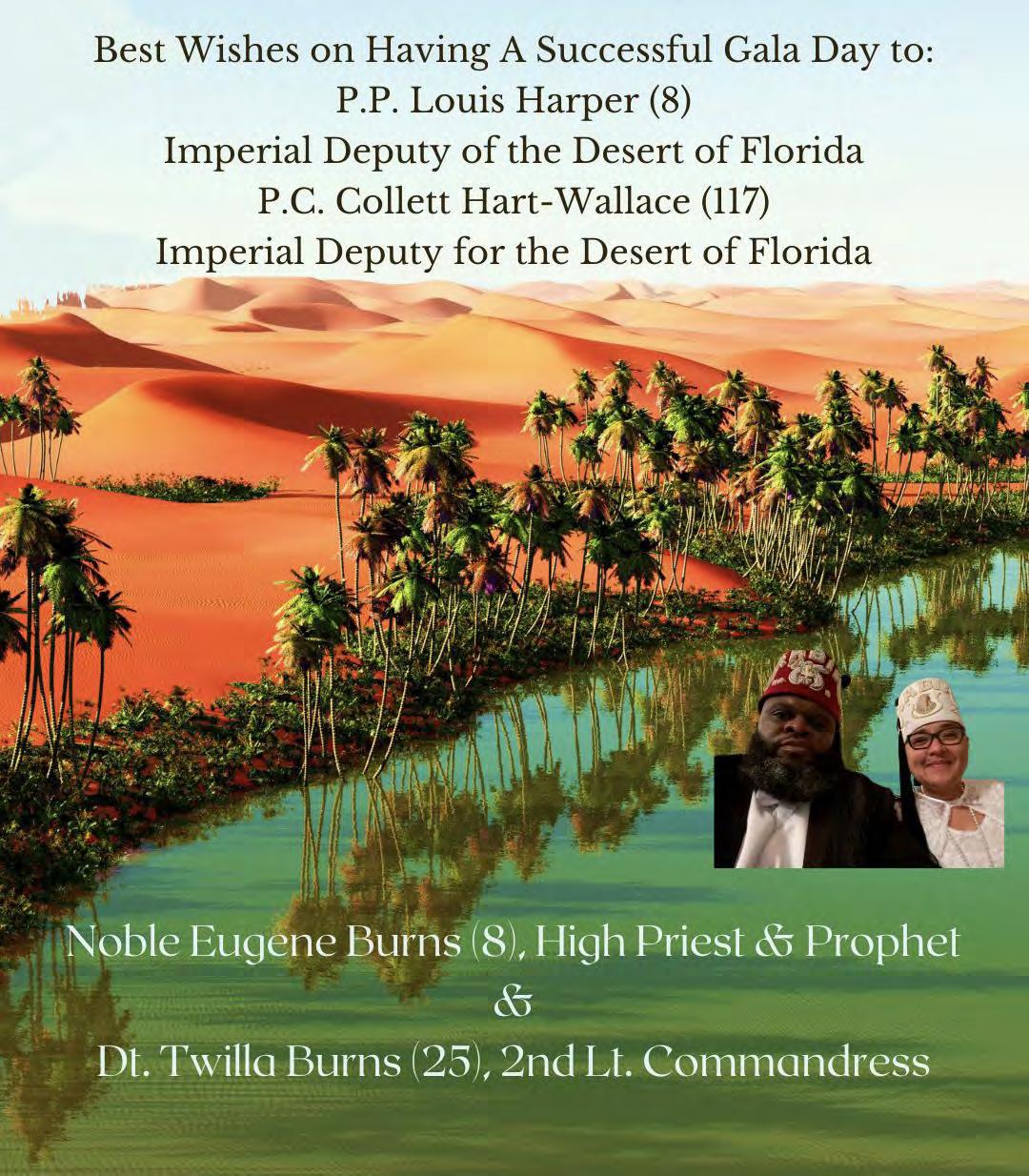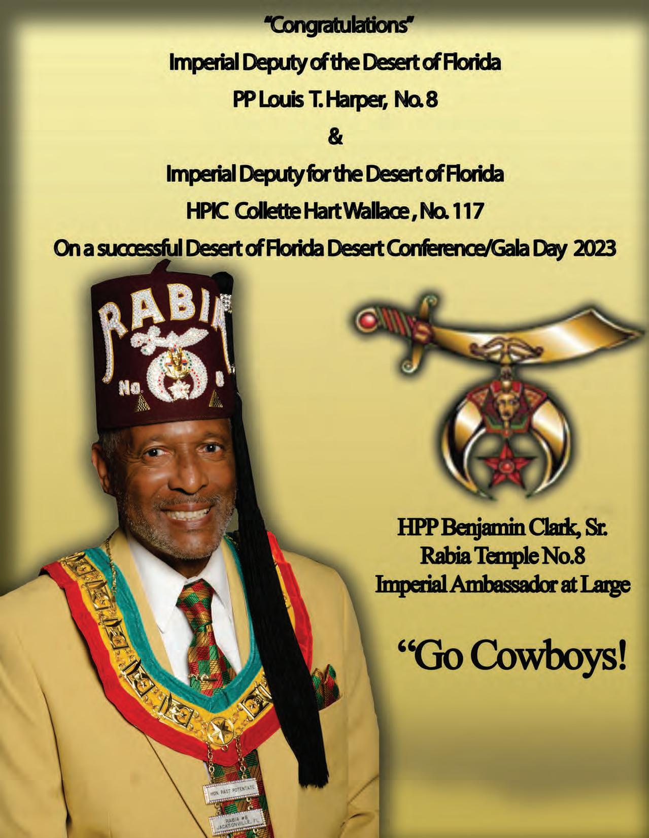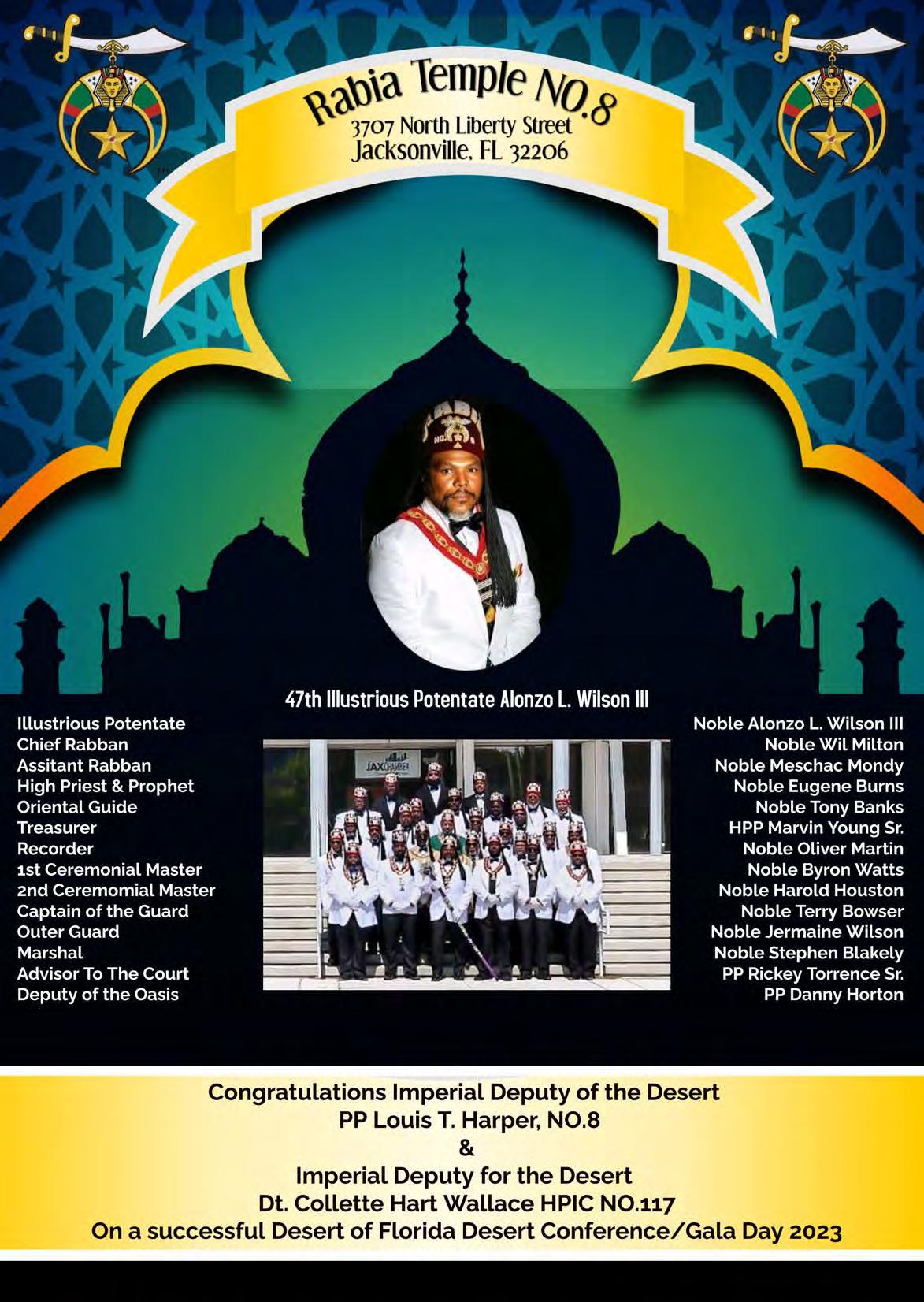 in the Lord with all thine heart And lean not unto thine own understanding. In all thy ways acknowledge him, And he shall direct thy paths. Proverbs 3:5-6 Congratulations on a Successful, Rewarding & Blessed Gala Day Imperial Deputy of the Desert of Florida PP Louis T. Harper (8) & Imperial Deputy for the Desert of Florida Dt. Collette Hart Wallace (117) With Blessings Extended To Rabia Temple #8 Rabia Court #25 Dt. Marva Adell Murray, PC Recordress Daughter of the Year 2023 Osiris Court #70 Oasis of Melbourne Desert Executive Board/Budget Finance Committee Dt. Marva Adell Murray, PC # 70, (Chair) Dt. Lila Gaston, HPC #117 Dt. Laureatte Scott, PC #134 Dt. Sandra Trotter, PC #99 Dt. Sharolyn Turner #117 Daughters Desert Convention Chair