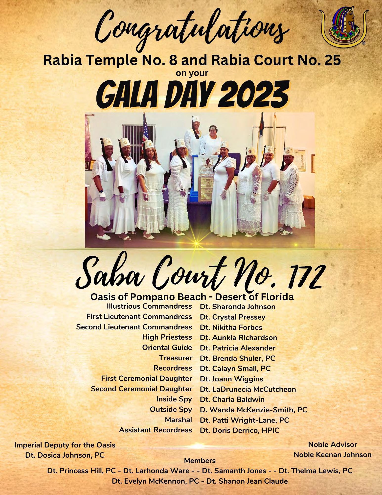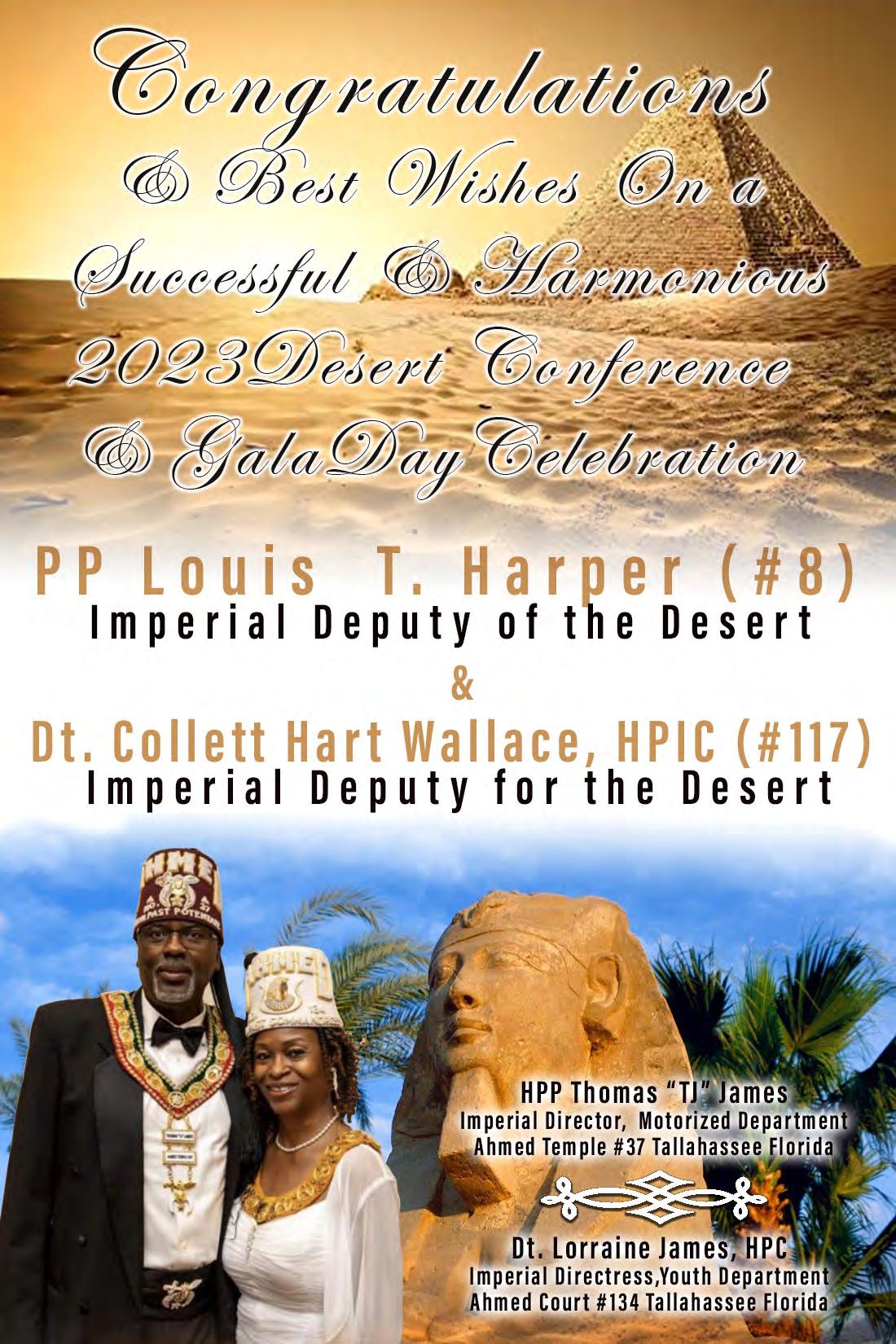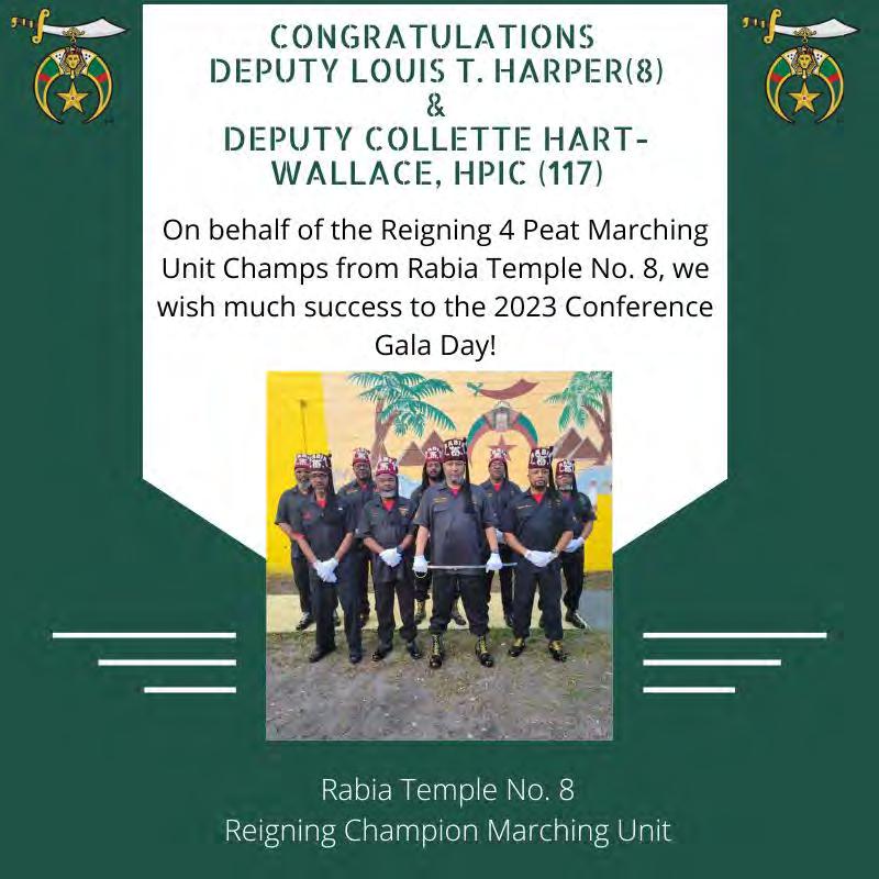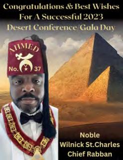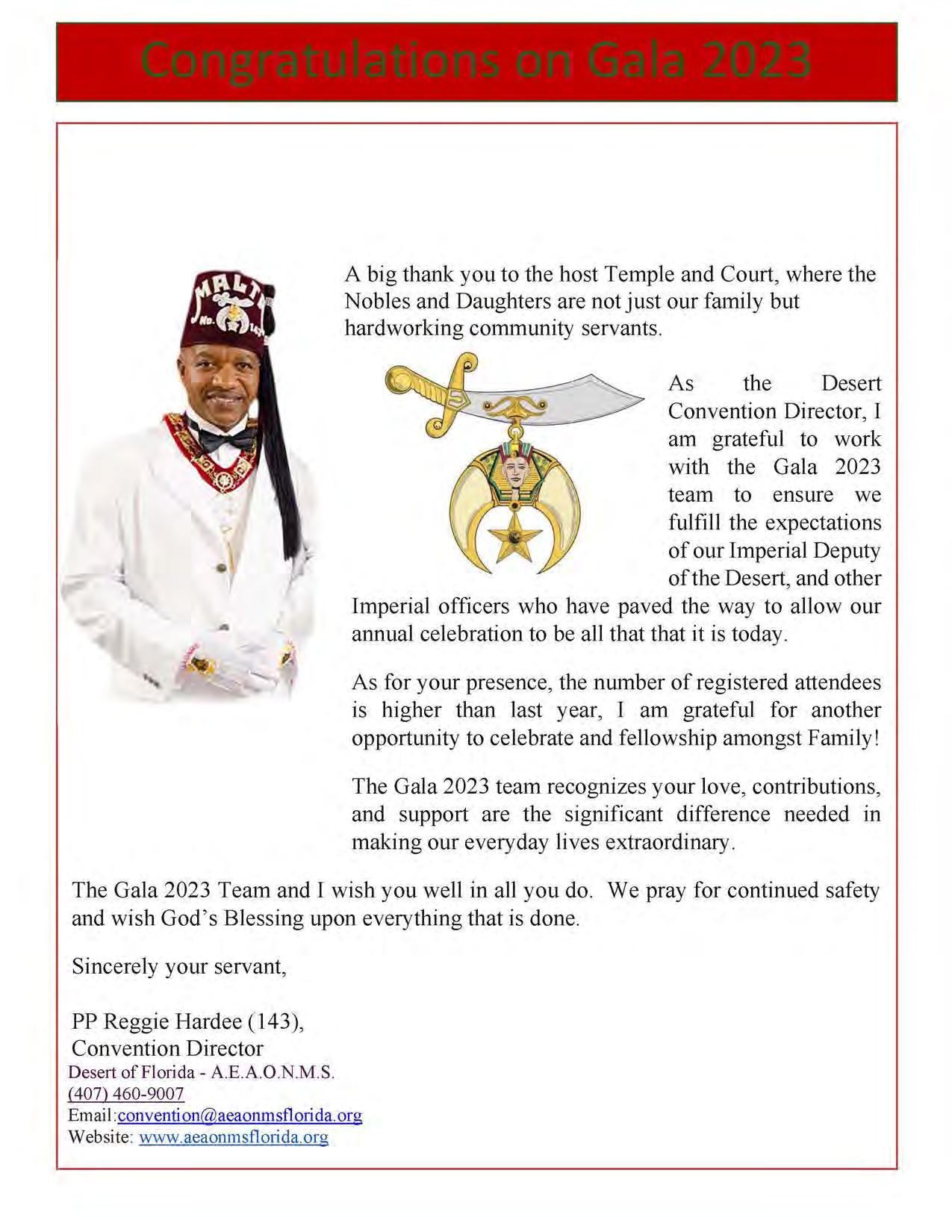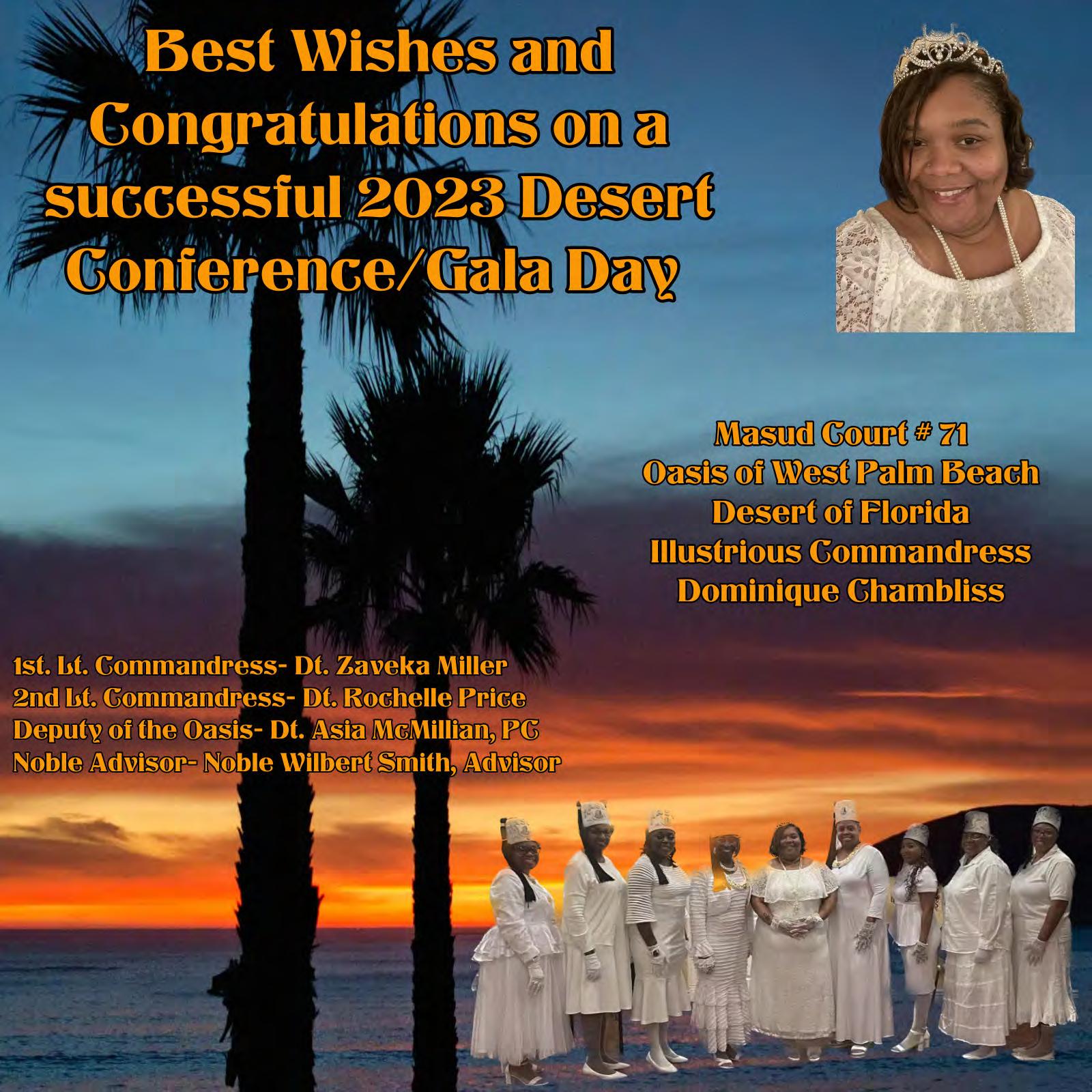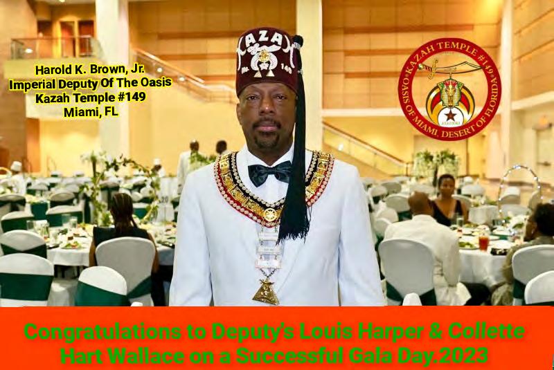 in the Lord with all thine heart And lean not unto thine own understanding. In all thy ways acknowledge him, And he shall direct thy paths. Proverbs 3:5-6 Congratulations on a Successful, Rewarding & Blessed Gala Day Imperial Deputy of the Desert of Florida PP Louis T. Harper (8) & Imperial Deputy for the Desert of Florida Dt. Collette Hart Wallace (117) With Blessings Extended To Rabia Temple #8 Rabia Court #25 Dt. Marva Adell Murray, PC Recordress Daughter of the Year 2023 Osiris Court #70 Oasis of Melbourne Desert Executive Board/Budget Finance Committee Dt. Marva Adell Murray, PC # 70, (Chair) Dt. Lila Gaston, HPC #117 Dt. Laureatte Scott, PC #134 Dt. Sandra Trotter, PC #99 Dt. Sharolyn Turner #117 Daughters Desert Convention Chair