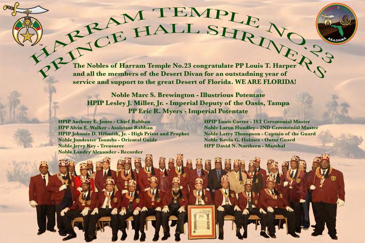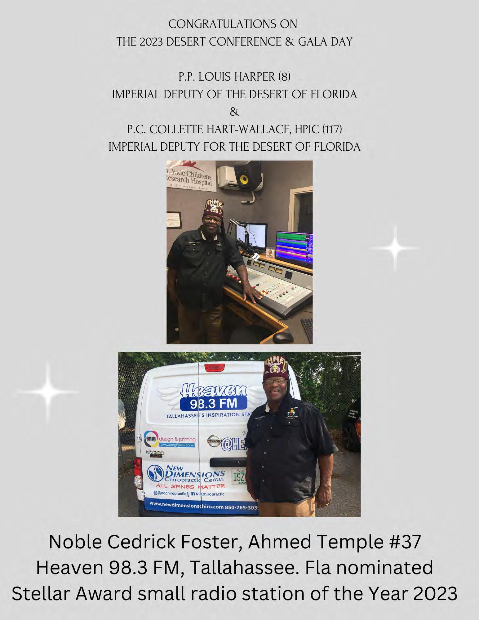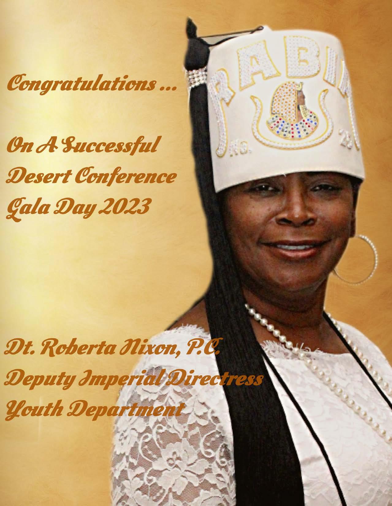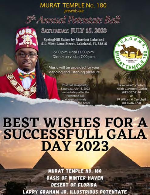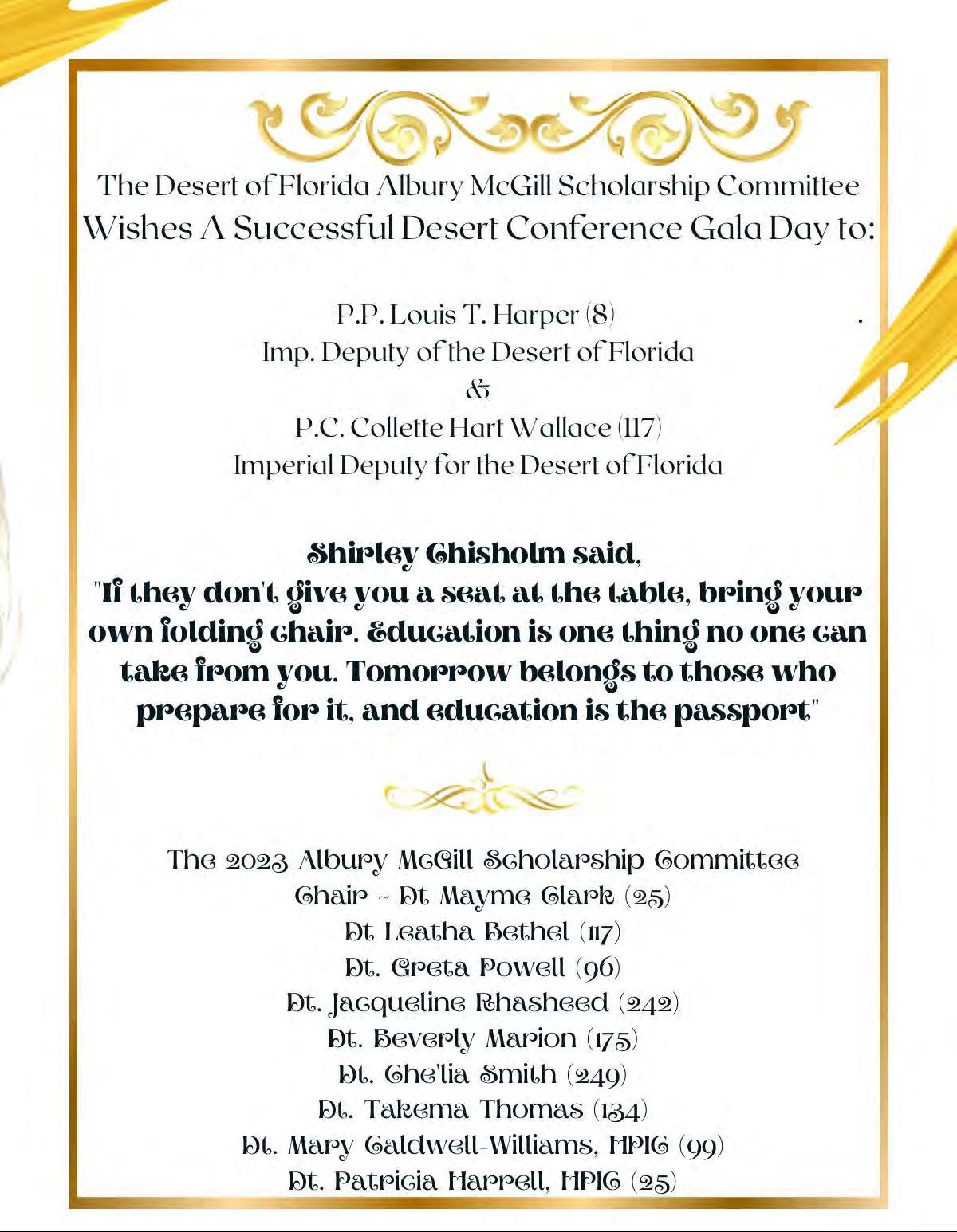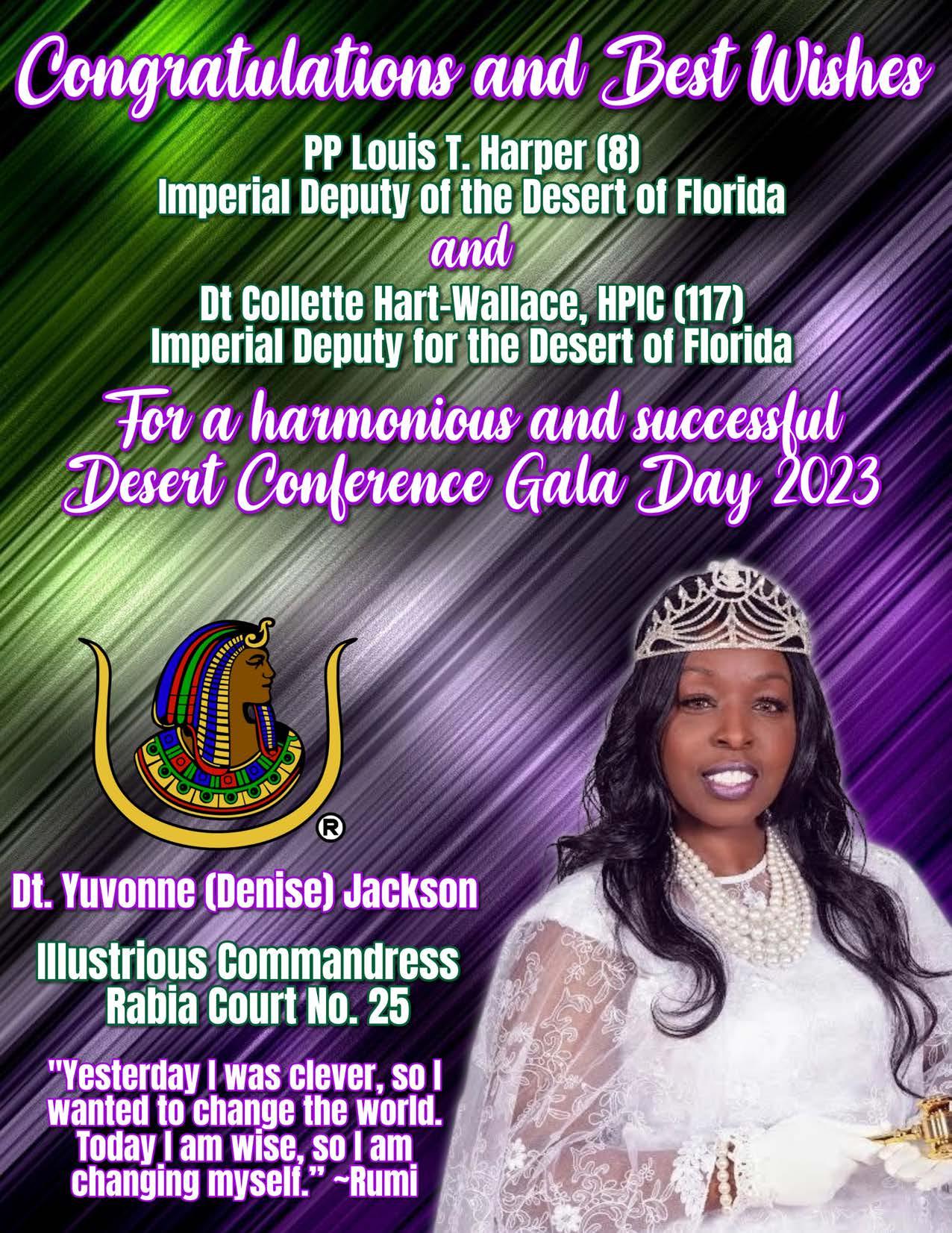 in the Lord with all thine heart And lean not unto thine own understanding. In all thy ways acknowledge him, And he shall direct thy paths. Proverbs 3:5-6 Congratulations on a Successful, Rewarding & Blessed Gala Day Imperial Deputy of the Desert of Florida PP Louis T. Harper (8) & Imperial Deputy for the Desert of Florida Dt. Collette Hart Wallace (117) With Blessings Extended To Rabia Temple #8 Rabia Court #25 Dt. Marva Adell Murray, PC Recordress Daughter of the Year 2023 Osiris Court #70 Oasis of Melbourne Desert Executive Board/Budget Finance Committee Dt. Marva Adell Murray, PC # 70, (Chair) Dt. Lila Gaston, HPC #117 Dt. Laureatte Scott, PC #134 Dt. Sandra Trotter, PC #99 Dt. Sharolyn Turner #117 Daughters Desert Convention Chair