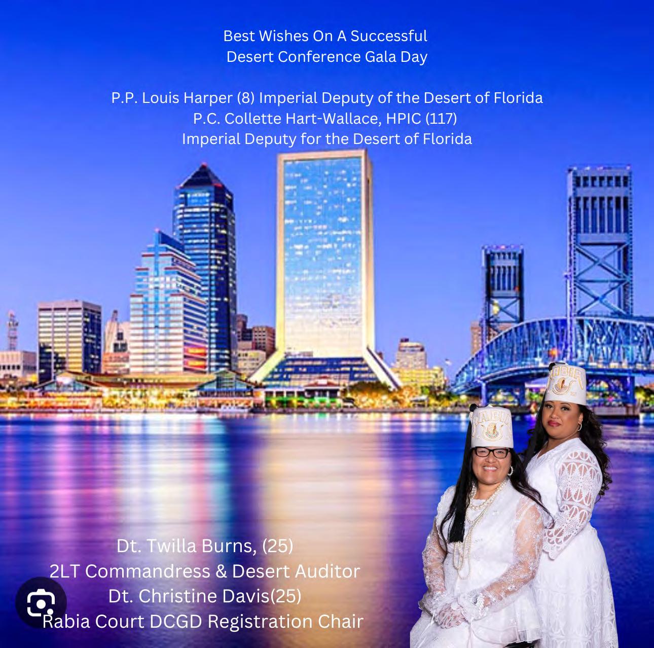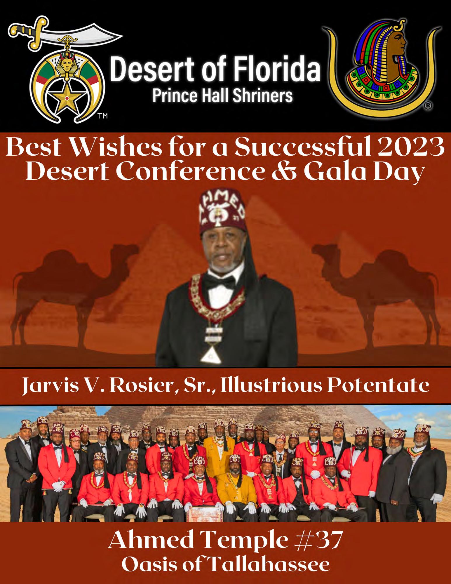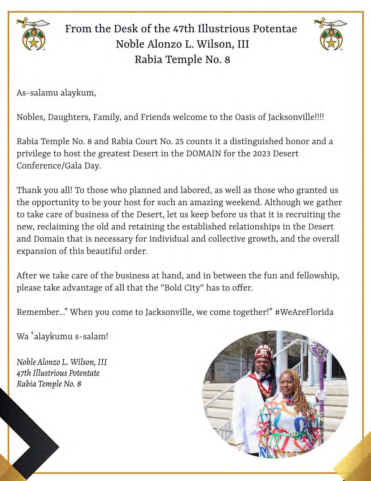It is my esteemed honor and pleasure to welcome you to our 2023 Desert Conference Gala Day. I am truly excited that you have chosen to visit with us in the Oasis of Jacksonville. We look forward to making this an opportunity to obtain knowledge as well as a relaxing destination to unwind.