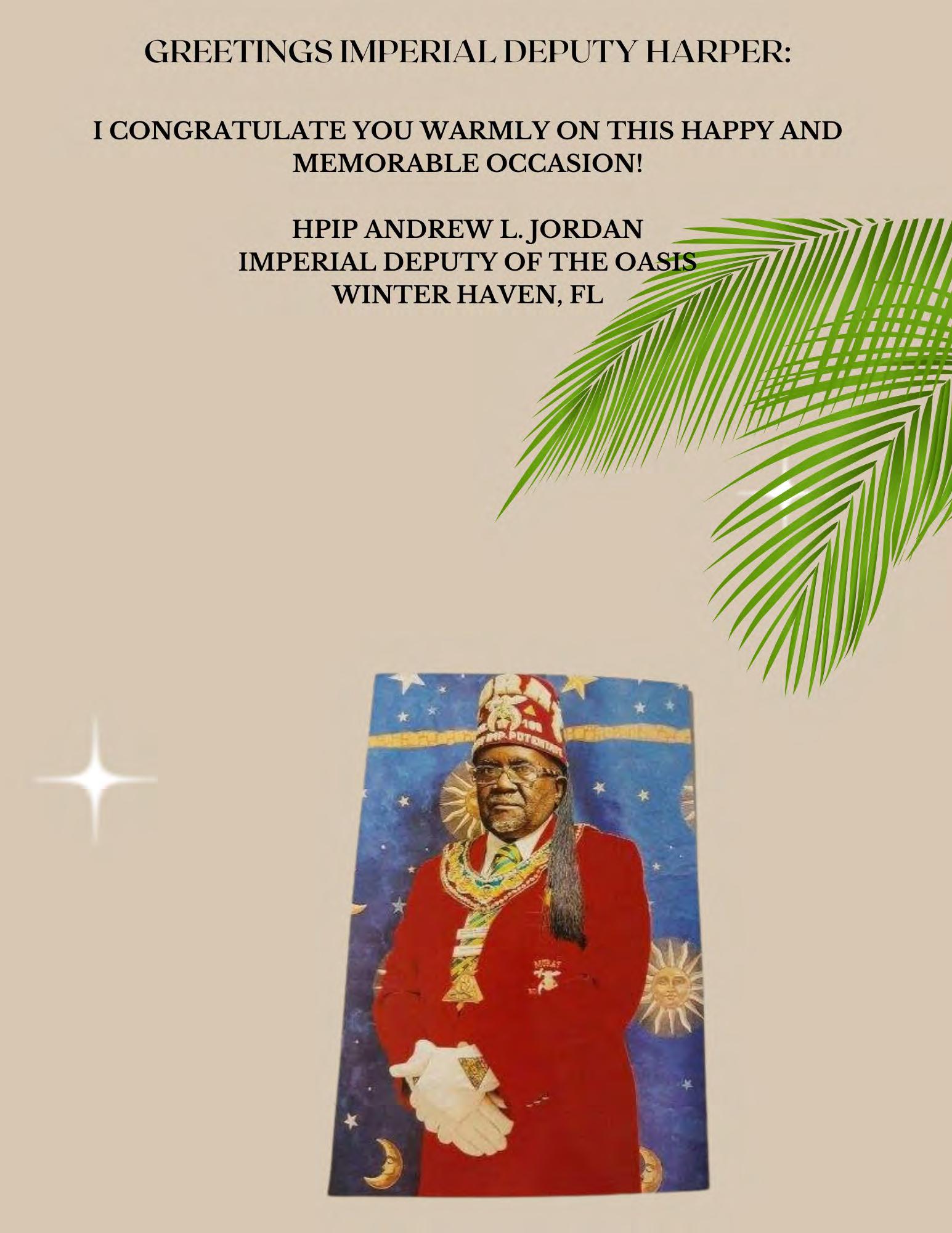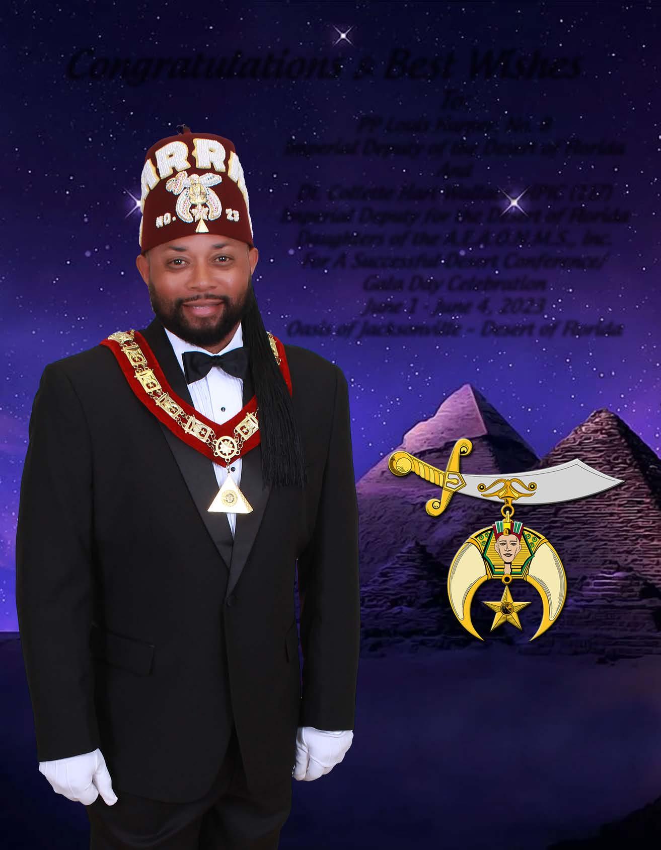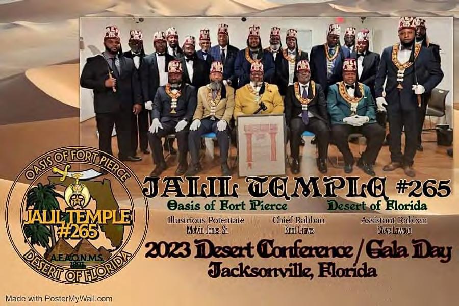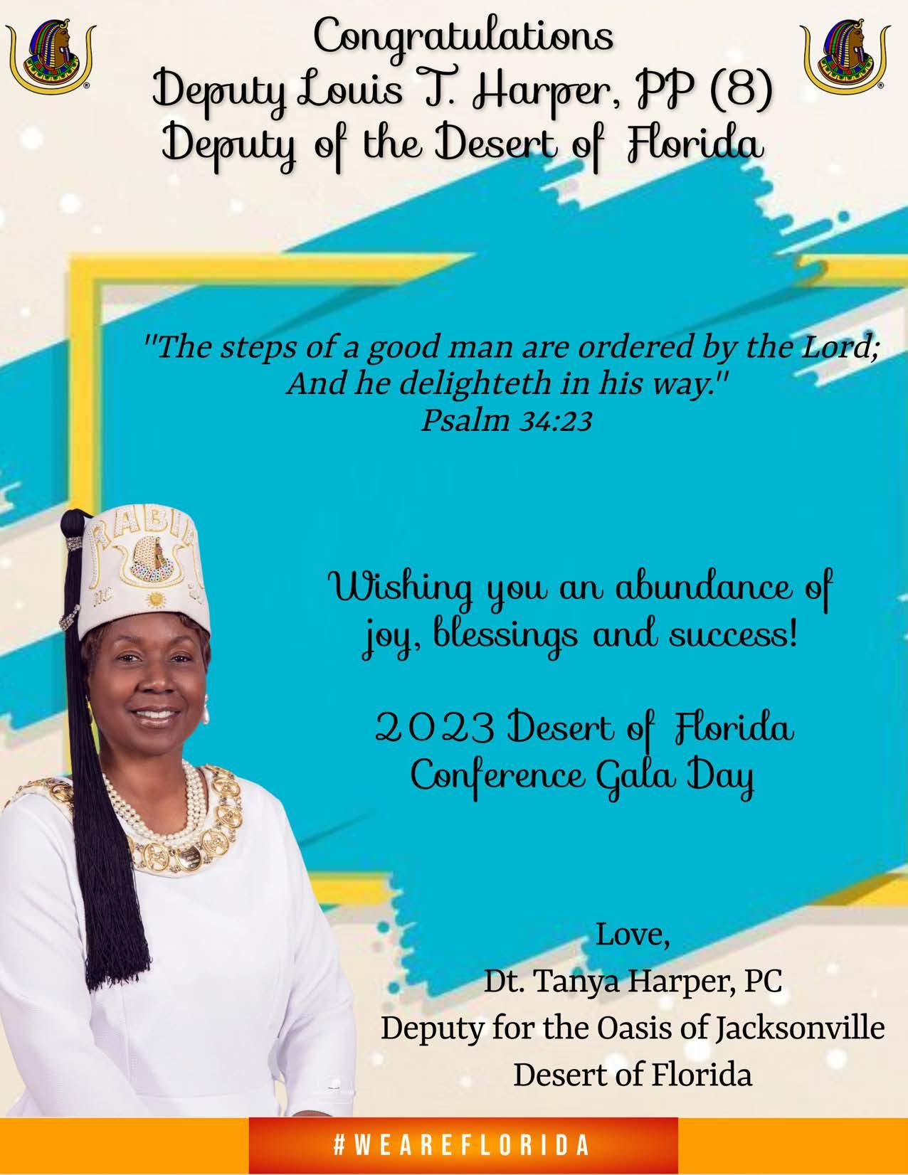 It is my esteemed honor and pleasure to welcome you to our 2023 Desert Conference Gala Day. I am truly excited that you have chosen to visit with us in the Oasis of Jacksonville. We look forward to making this an opportunity to obtain knowledge as well as a relaxing destination to unwind.